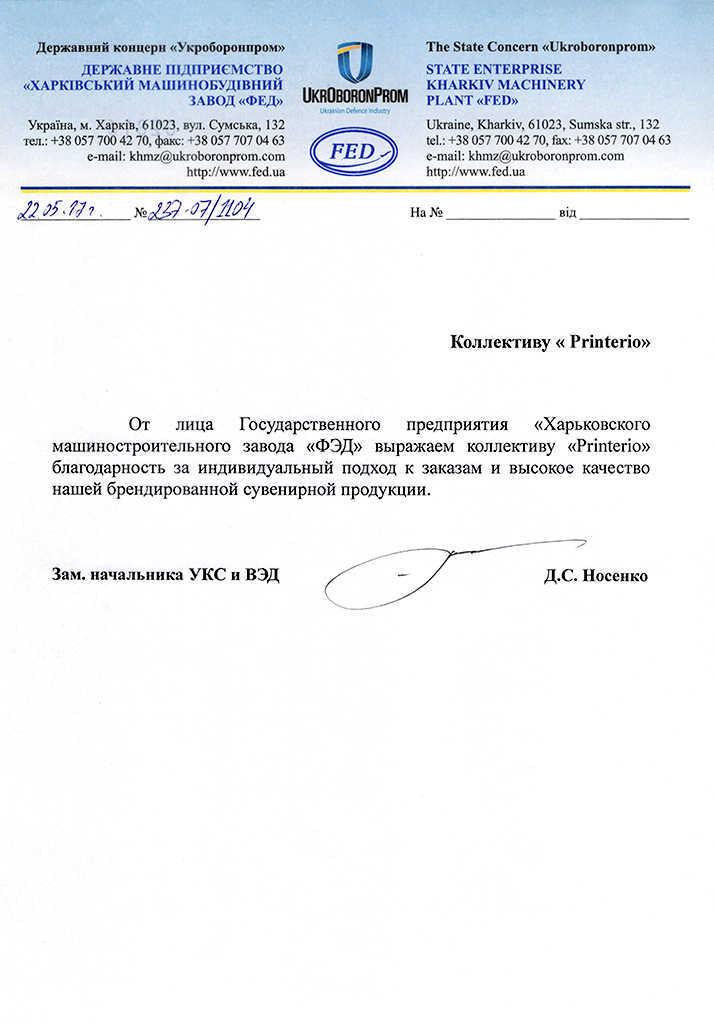 От лица государственного предприятия "Харьковского машиностроительного завода ФЭД" выражаем коллективу "Printerio" благодарность за индивидуальный подход к заказам, и высокое качество нашей брендированной сувенирной продукции.