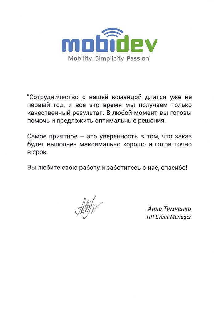 "Сотрудничество с вашей командой длится уже не первый год, и все это время мы получаем только качественный результат. В любой момент вы готовы помочь и предложить оптимальные решения. Самое приятное – это уверенность в том, что заказ будет выполнен максимально хорошо и готов точно в срок. Вы любите свою работу и заботитесь о нас, спасибо!"