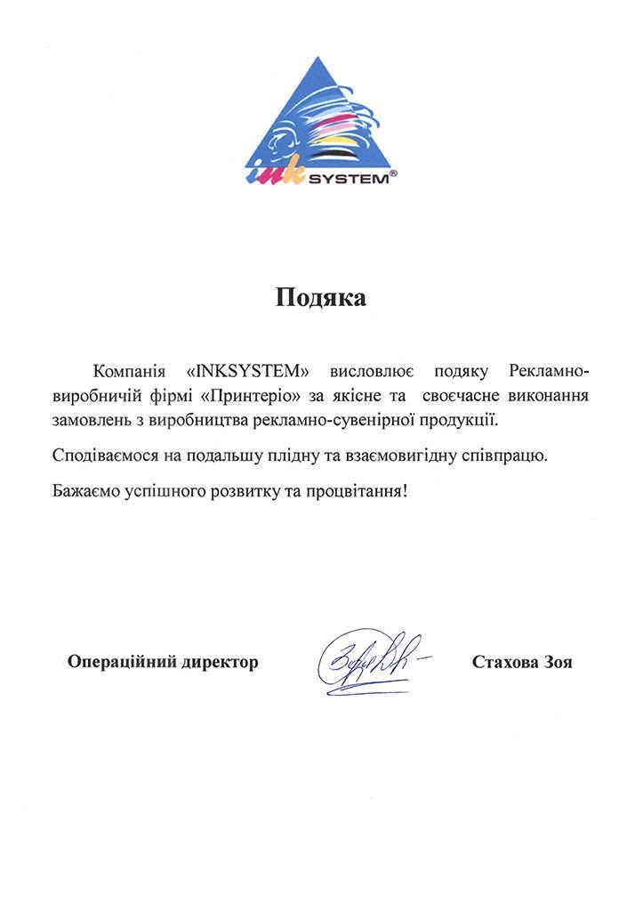 Компания «INKSYSTEM» благодарит рекламно-производственную фирму «Принтерио» за качественное и своевременное выполнение заказов по производству рекламно-сувенирной продукции.
