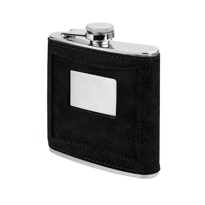 Фляга из нержавеющей стали, одинарной стенкой, обтянута эко кожей с прямоугольным окошком для нанесения.