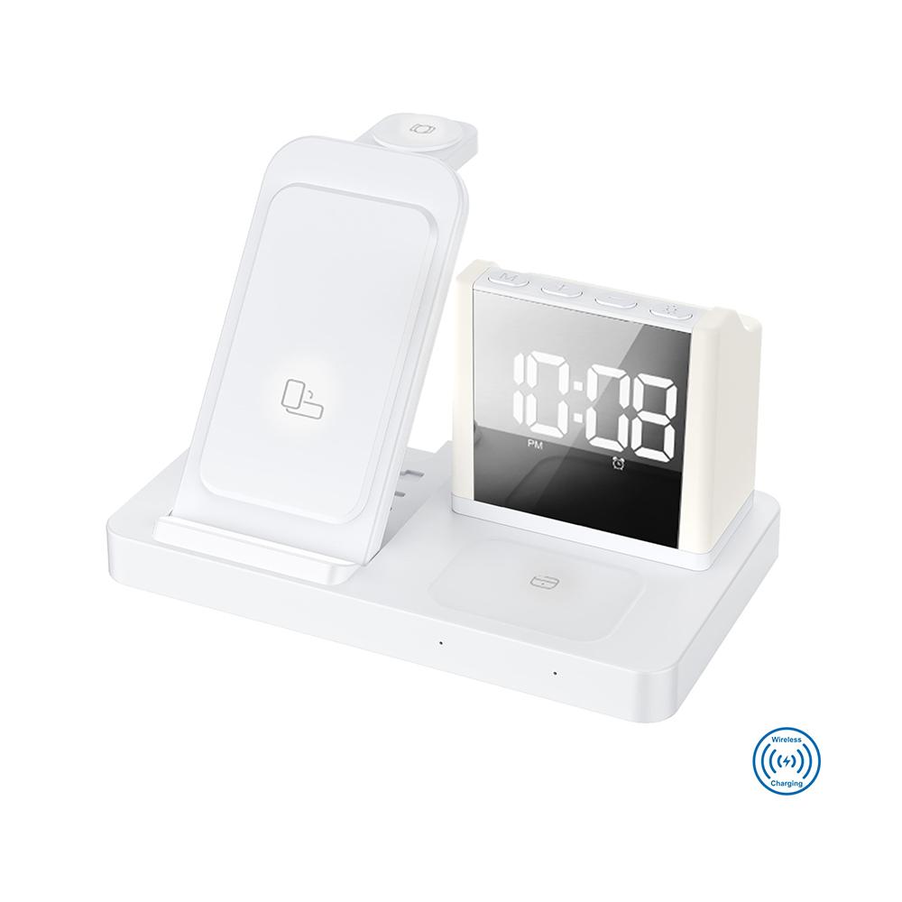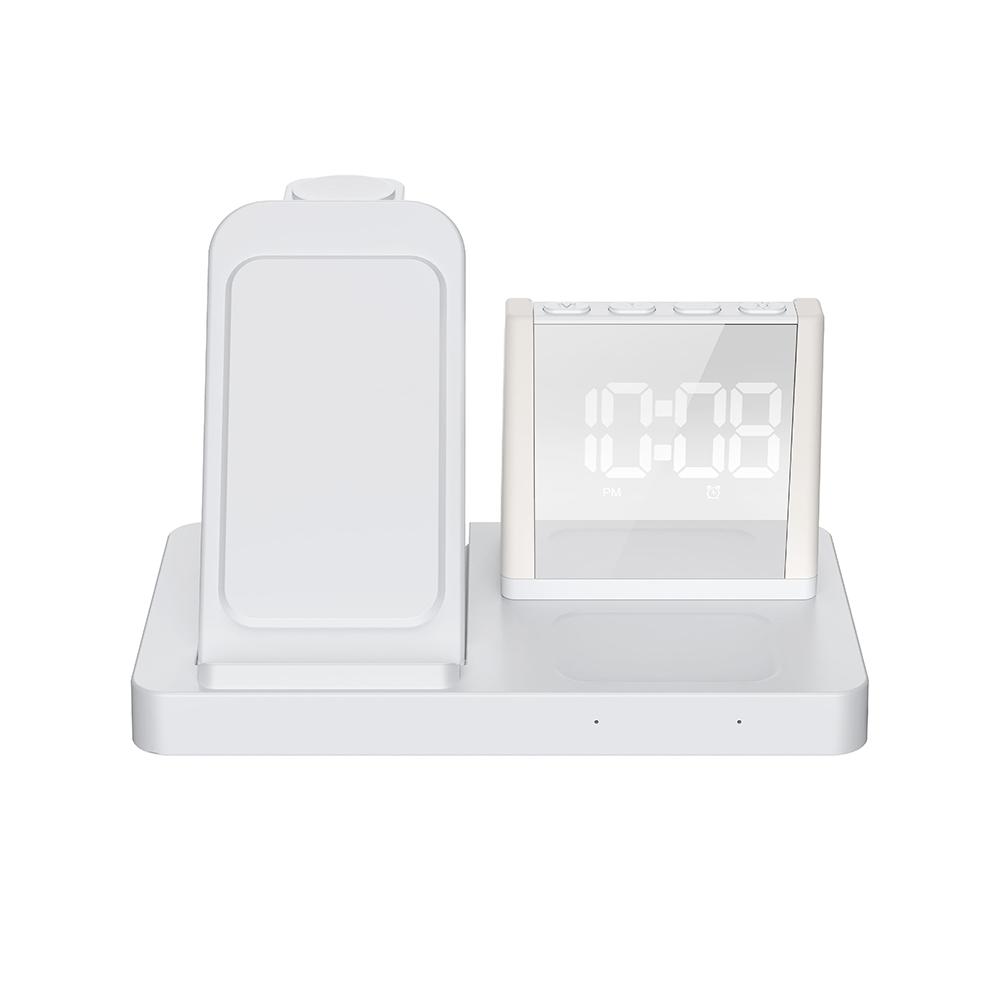 Беспроводное зарядное устройство с часами Time Dock. Можно заряжать смартфон, смарт-часы Apple Watch, наушники. Рекомендуется заряжать через блок питания QC3.0 quick charge. Удобная подставка: оптимально подобранный угол наклона позволяет использовать подставку во время просмотра видео на телефоне. Шнур питания зарядного устройства в комплекте. Телефон устанавливается на подставку, наушники TWS — на коврик, а смарт-часы — на специальную подставку. Зарядное устройство обеспечивает выходную мощность 15 Вт при размещении одного устройства на подставке и интеллектуально регулирует выходную мощность от 5 до 10 Вт в зависимости от потребностей энергопотребления устройства. Цифровой будильник, который идет в комплекте, питается от литиевой батареи. Часы имеют LED-экран с возможностью отображения времени в форматах 12 часов и 24 часа, 5 уровней регулировки яркости и кнопку отложенного сигнала. Панель часов также имеет режим ночного света и подставку для ручек на задней стенке часов.