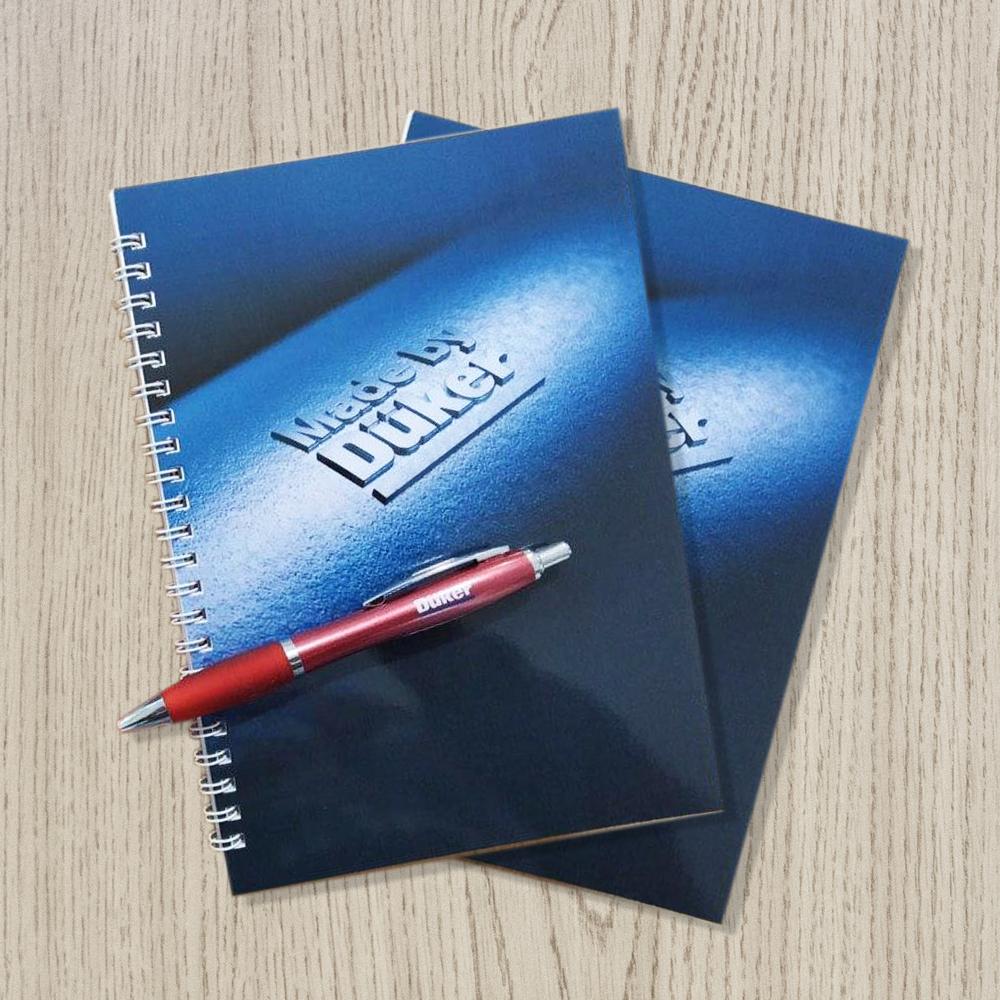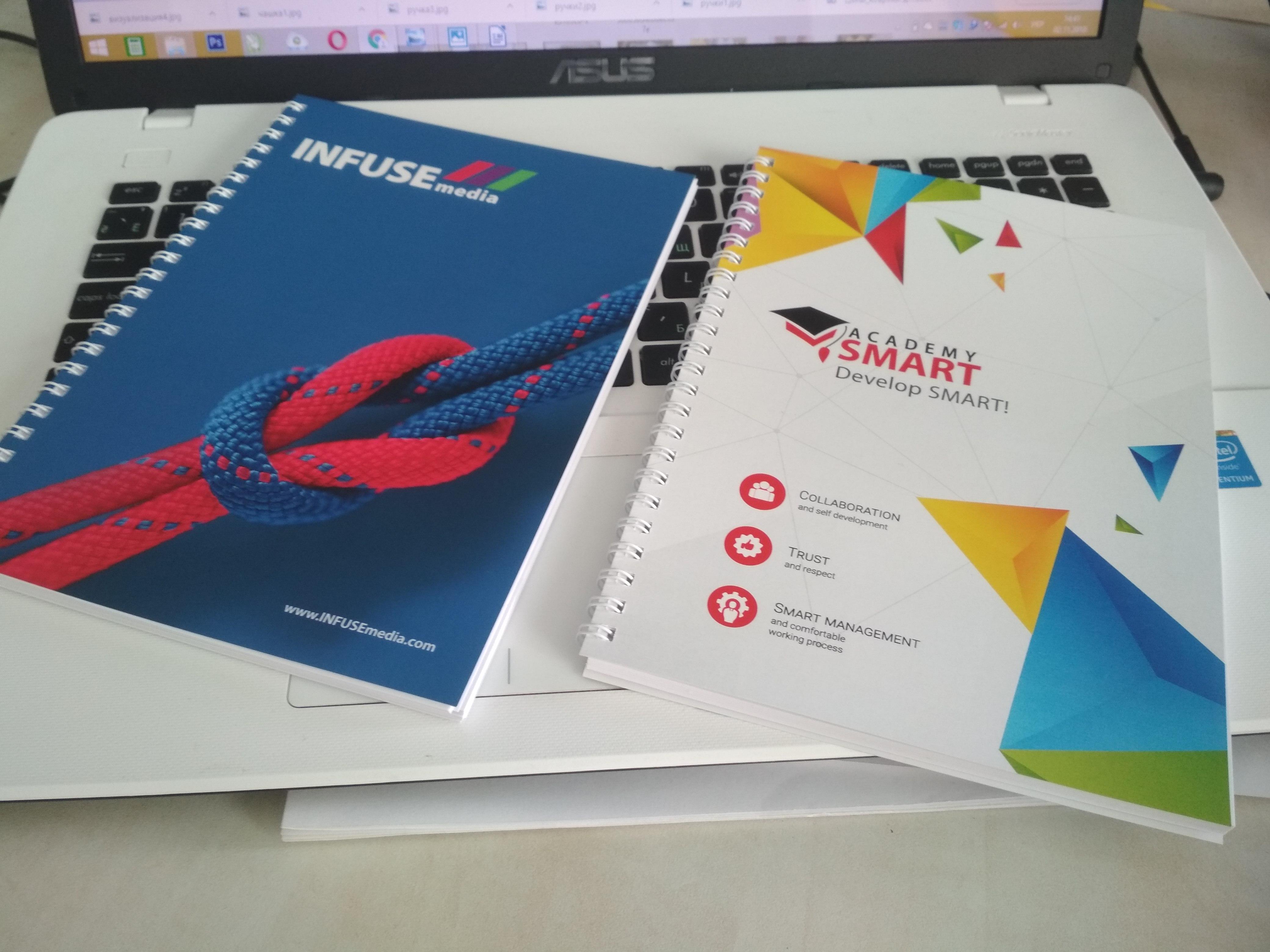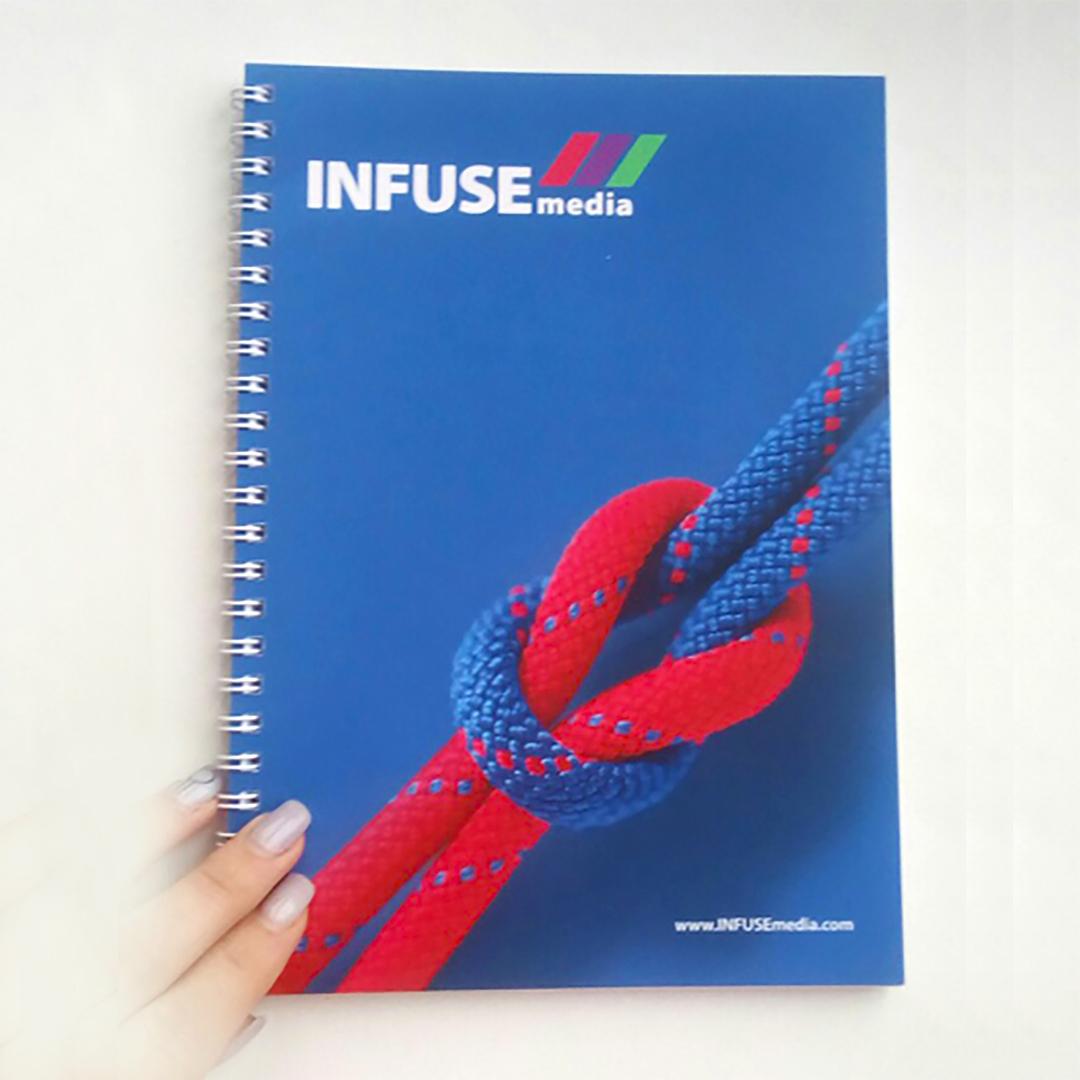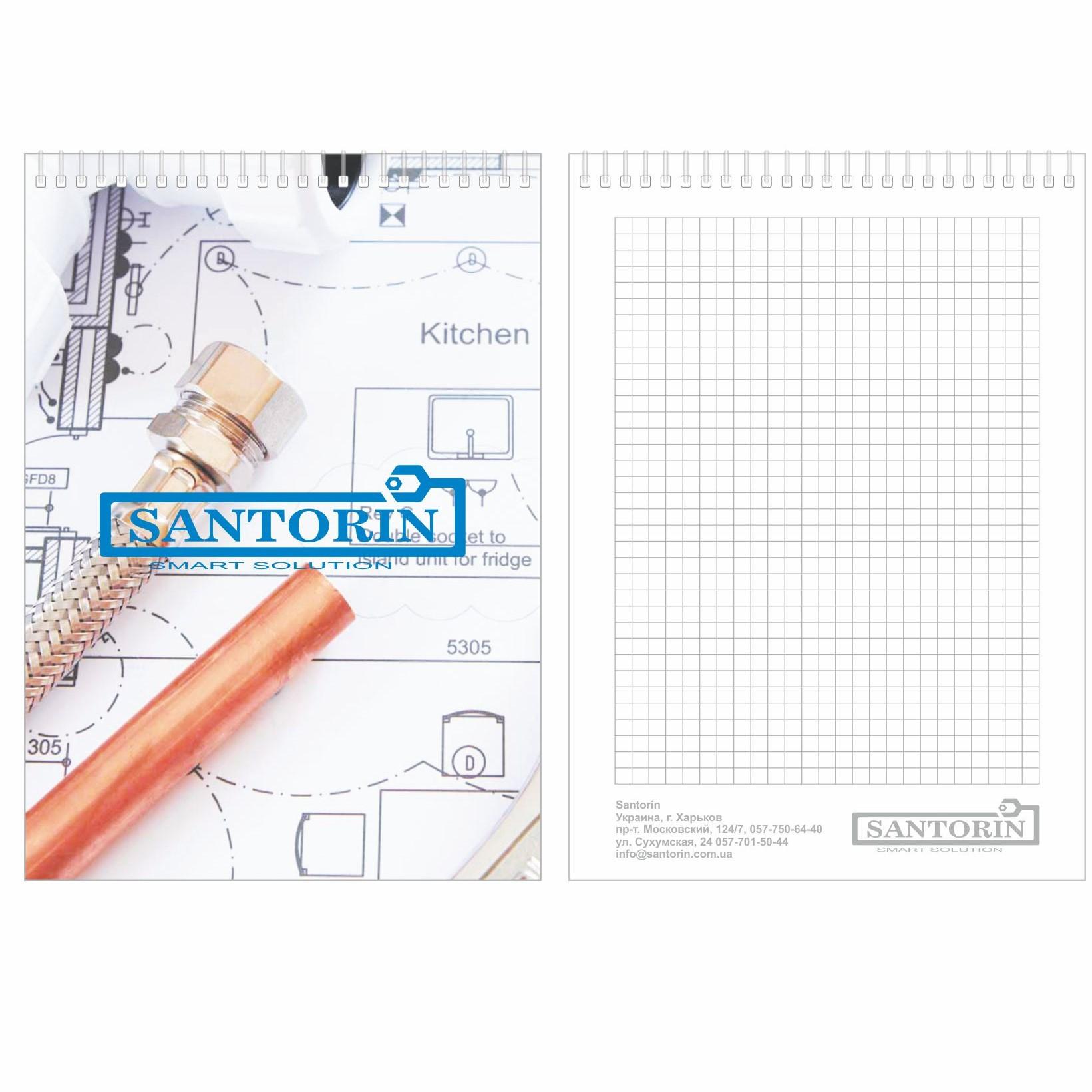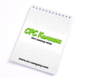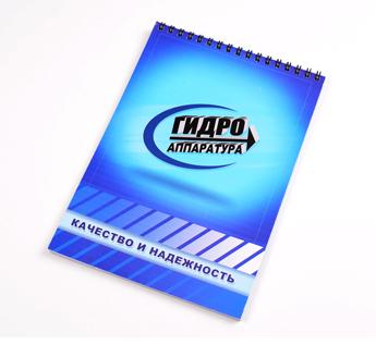 Цветная обложка на плотном картоне 350 г/м2, внутренний блок - бумага плотностью 80 г\м2. Листы внутреннего блока могут быть с нанесённой клеткой или линейкой и логотипом, печатаются одним цветом. Сборка на металическую пружину по короткой или длинной стороне. Блокнот имеет 48 листов. Формат А4, А5, А6.