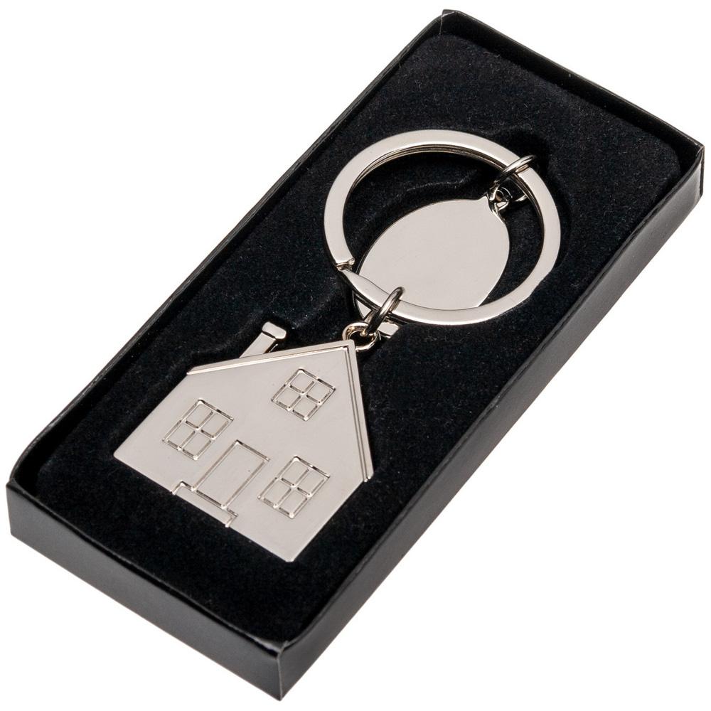 Металлический брелок в форме домика с округлым вывеской. Оснащен кольцом для ключей.