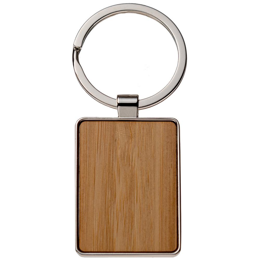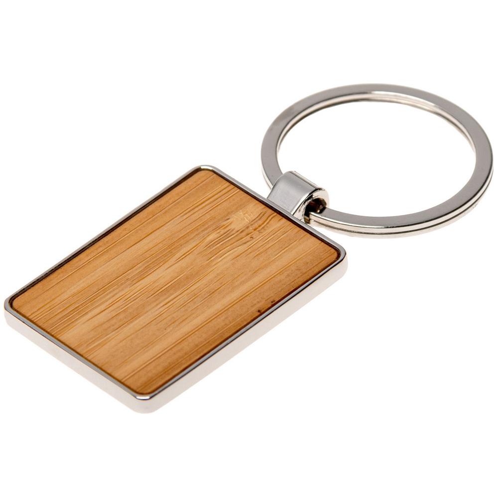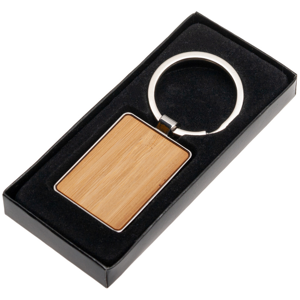 Прямоугольный брелок со вставкой из бамбука. Оснащен кольцом Ø35 мм для ключей.