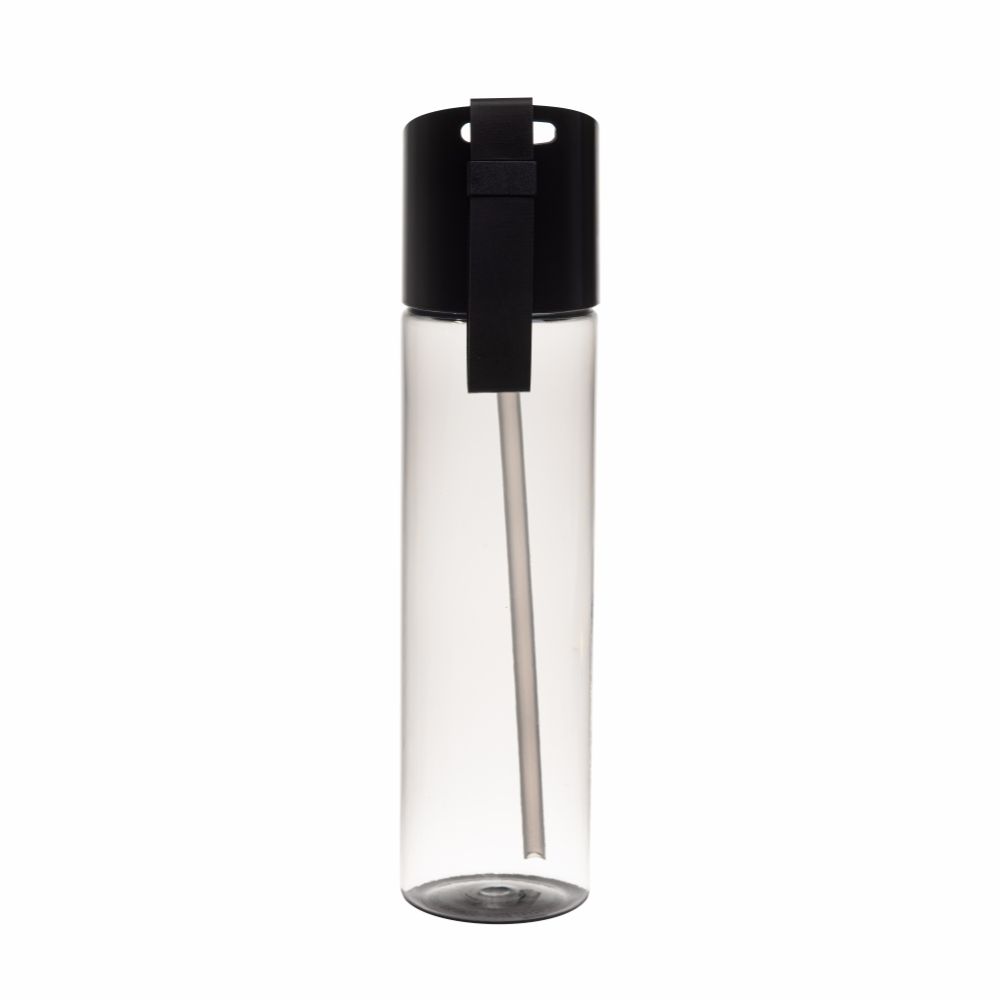 Объем бутылки — 650 мл. Крышка оснащена кнопкой, которую нужно нажать, чтобы попить, и всасывающей насадкой из силикона. Прочный пластиковый ремешок обеспечивает удобное переноса.