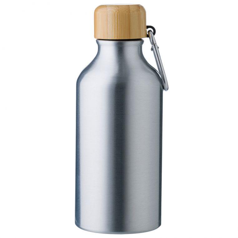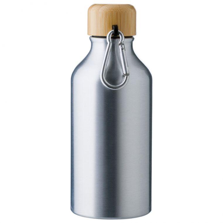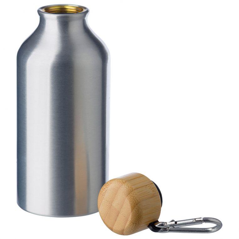 Алюминиевая бутылка для воды с бамбуковой крышкой и карабином. Удобный аксессуар для любителей активного образа жизни.