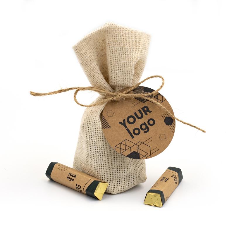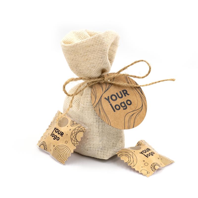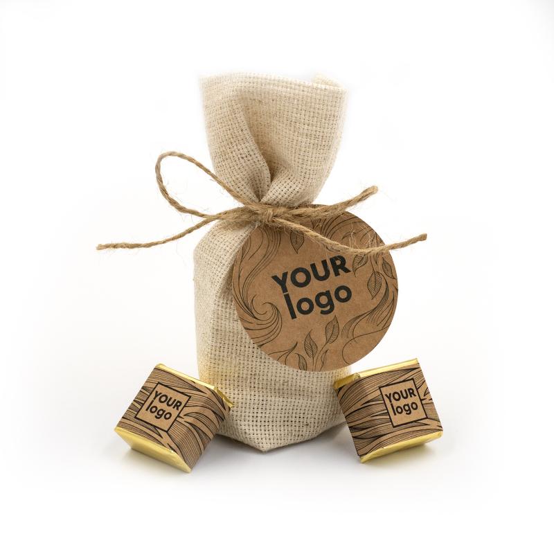 Джутовый мешочек (46, 65, 66 г) с логотипом крафт – это стильный и естественный выбор для корпоративных подарков. Его наполняют разнообразными вкусностями, в частности, шоколадными конфетами или драже, весом 46, 65 или 66 граммов. Благодаря использованию натурального джута такая упаковка выглядит экологично и привлекательно, а также поддерживает тренд на экологические и удобные упаковки.