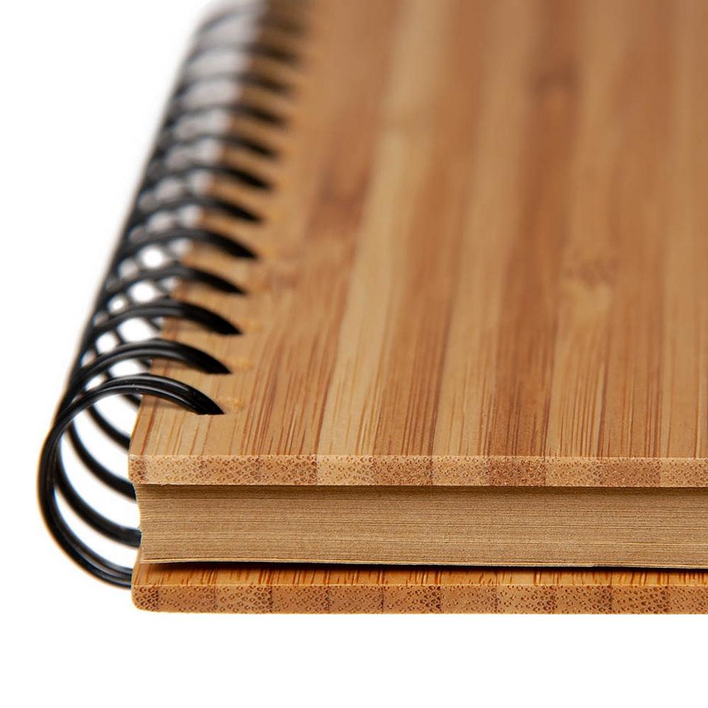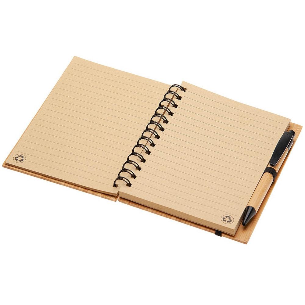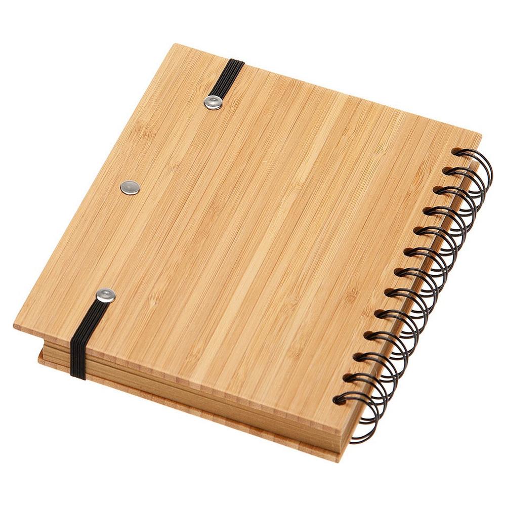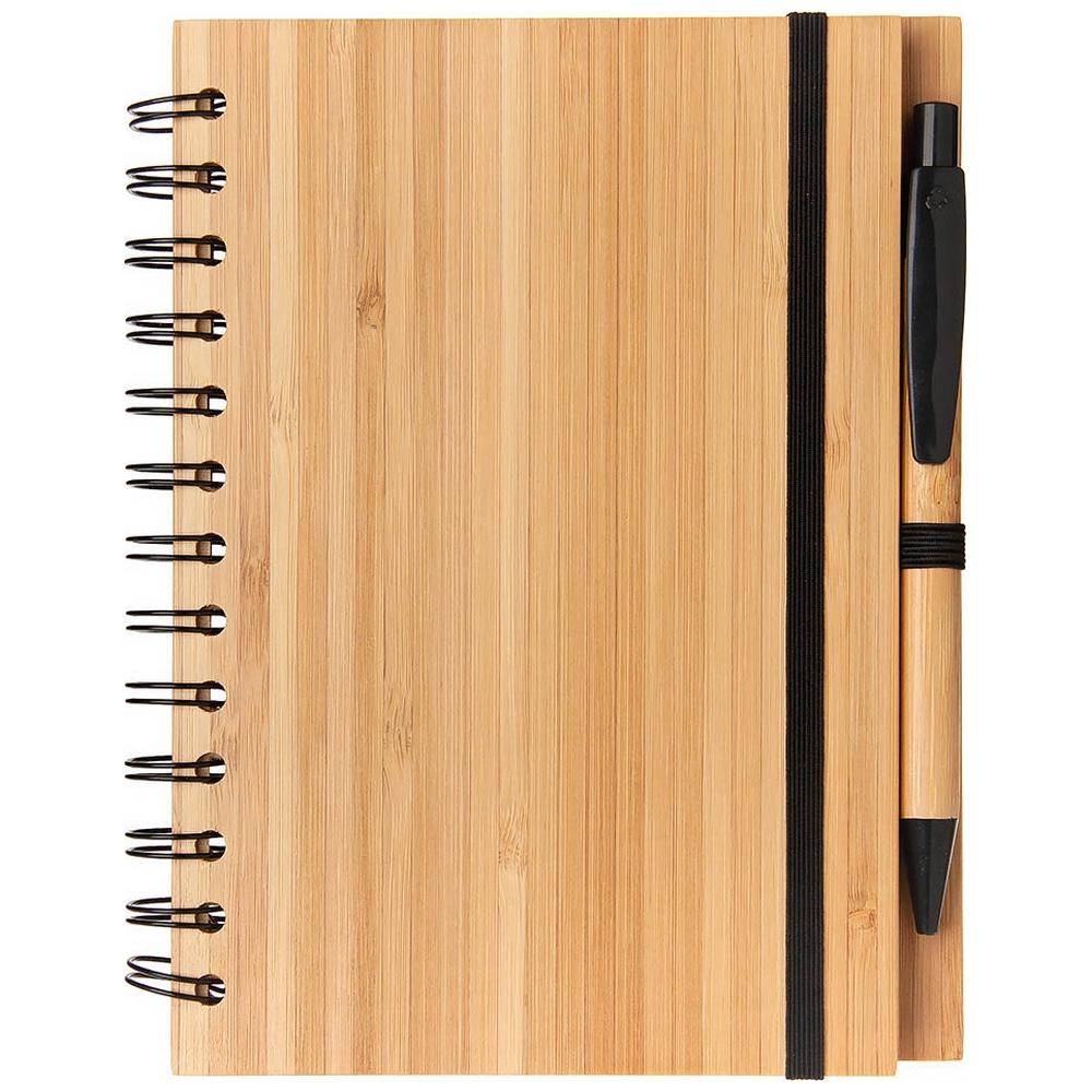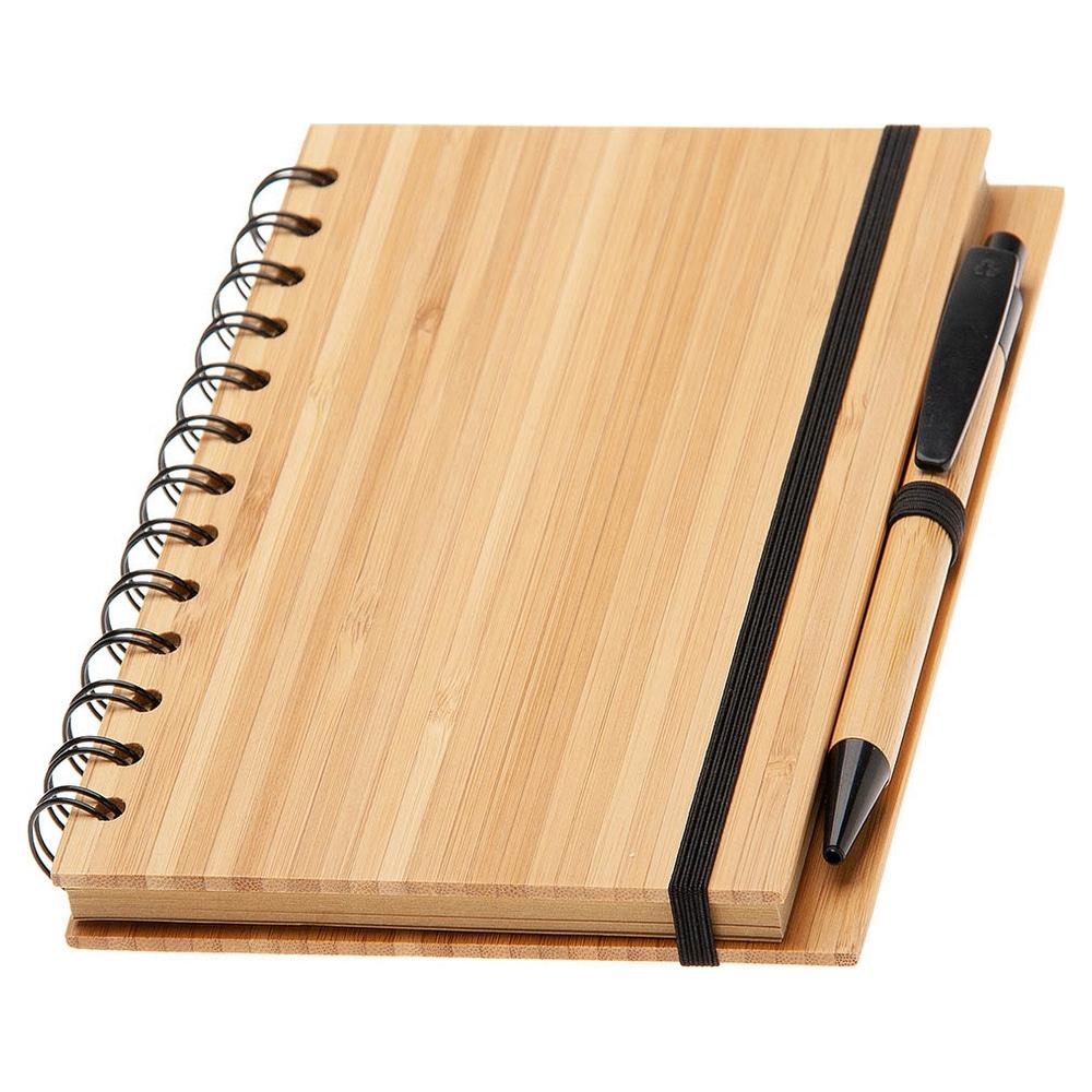 Блокнот с ручкой изготовлены из бамбука. Блокнот формата А5 с твердой обложкой, резинкой и держателем для шариковой ручки.