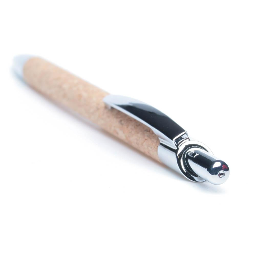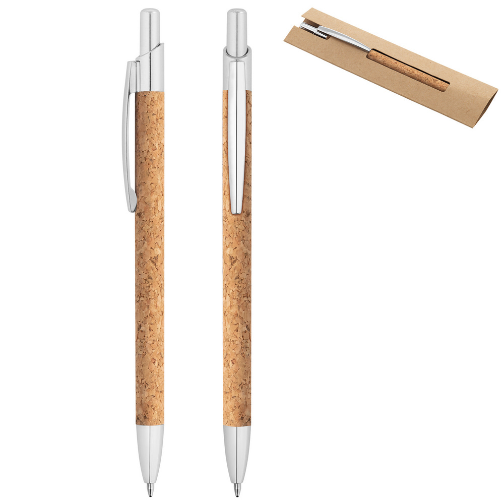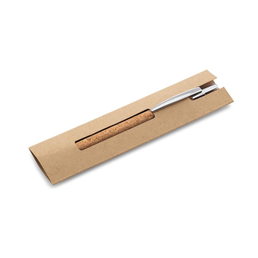 Шариковая ручка из пробки с алюминиевыми элементами с упаковкой. Поставляется в подарочном картонном чехле. Механизм – кнопочный.