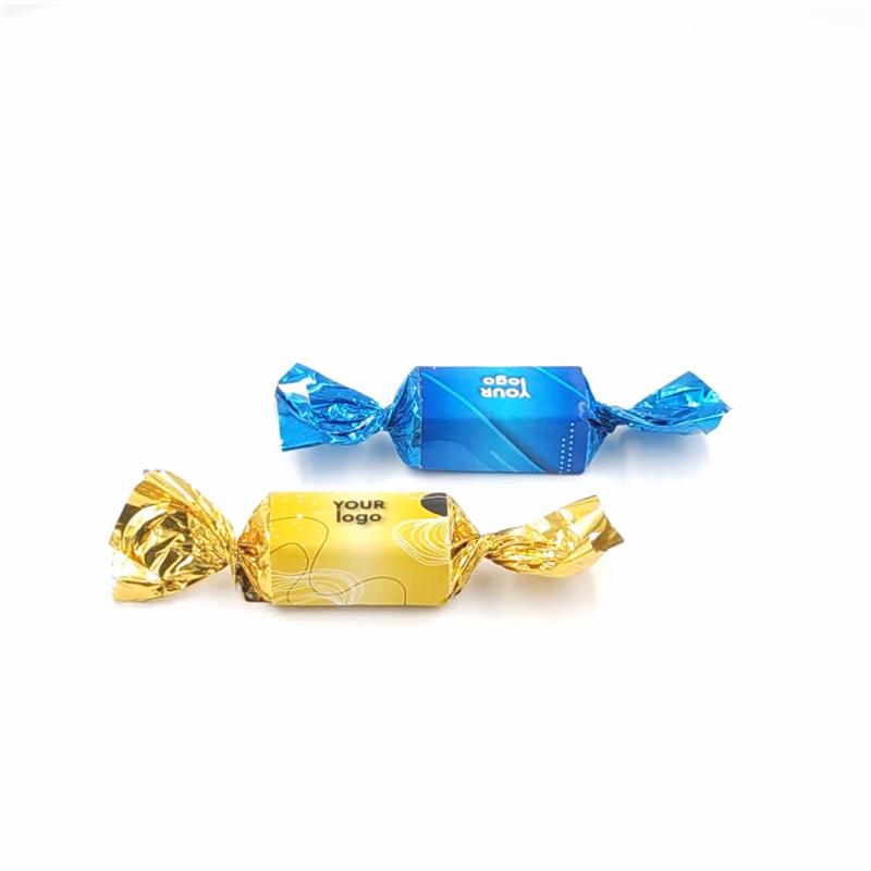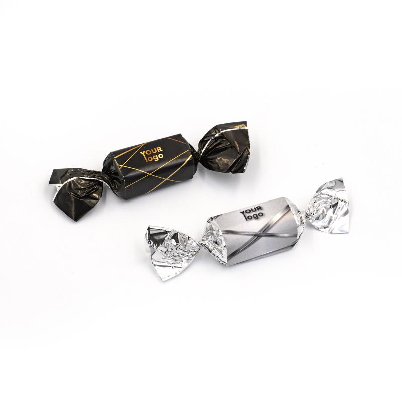 Вкусная фирменная конфета в формате подарочного сувенира. Внутри — классическое пралине с добавлением тертого ореха и вафельной крошки. Снаружи — яркая твист-пленка (на выбор: золотой, серебряный, розовый, черный, красный, синий, зеленый) с полноцветной печатью логотипа на самоклеящейся бумаге.