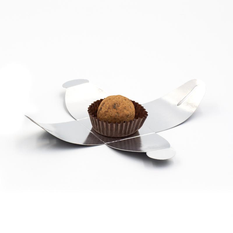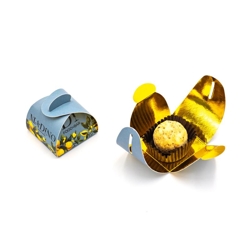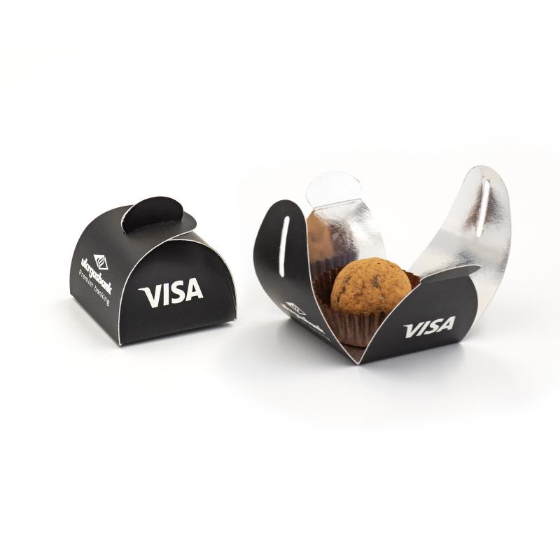 Премиальная конфета со вкусом французского трюфеля в элегантной упаковке. Шоколадное удовольствие в роскошной бонбоньерке размером 35×35×30 мм с индивидуальным логотипом с помощью полноцветной печати. Упаковка изготовлена из прочного картона плотностью 230 г с матовой или глянцевой ламинацией, а внутри — стильное золотое, серебряное или чёрное покрытие. Идеальное решение для подарков, корпоративных мероприятий или презентаций.