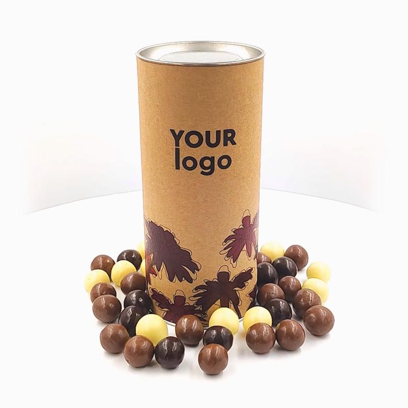 Коробка конфет «Драже» с логотипом 300 г в крафтовом тубусе – это стильный и практичный подарочный вариант, который подходит для брендирования на корпоративные мероприятия или промоакции. Упаковка из прочного крафт-картона в виде тубуса придает наборам стильный вид, обеспечивая защиту и удобство при транспортировке.