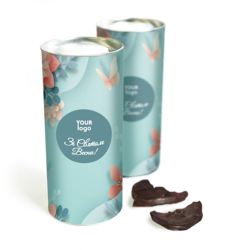 Премиальный подарок в стильном исполнении — цукаты из апельсина в темно-молочном шоколаде весом 300 г, упакованные в прочный картонный тубус (толщина 2 мм). Высота упаковки — 175 мм, диаметр — 80 мм. Полноцветная печать позволяет нанести ваш логотип или индивидуальный дизайн, что делает этот сладкий сувенир идеальным для корпоративных подарков или мероприятий.