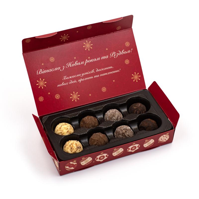 Премиальная коробка с французскими трюфелями в шоколаде — идеальный подарок или корпоративный сувенир. Оформление доступно в трёх вариантах: односторонняя печать, двусторонняя печать или премиум с тиснением золотом/серебром. Полноцветная печать на прочном картоне 230 г с матовой или глянцевой ламинацией придаёт упаковке стильный вид. Изысканный вкус и презентабельный дизайн сочетаются в формате 170 × 92 × 27 мм, создавая впечатление продукта премиум-класса. Тип упаковки: книга.