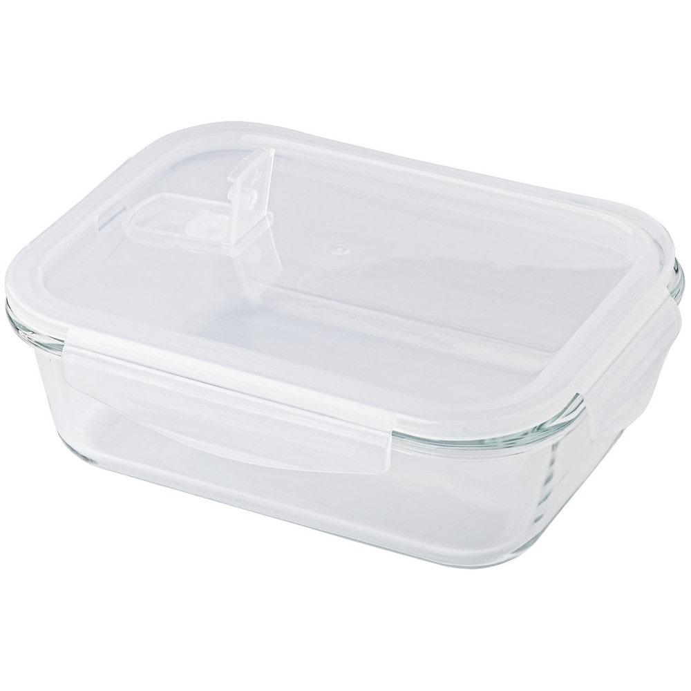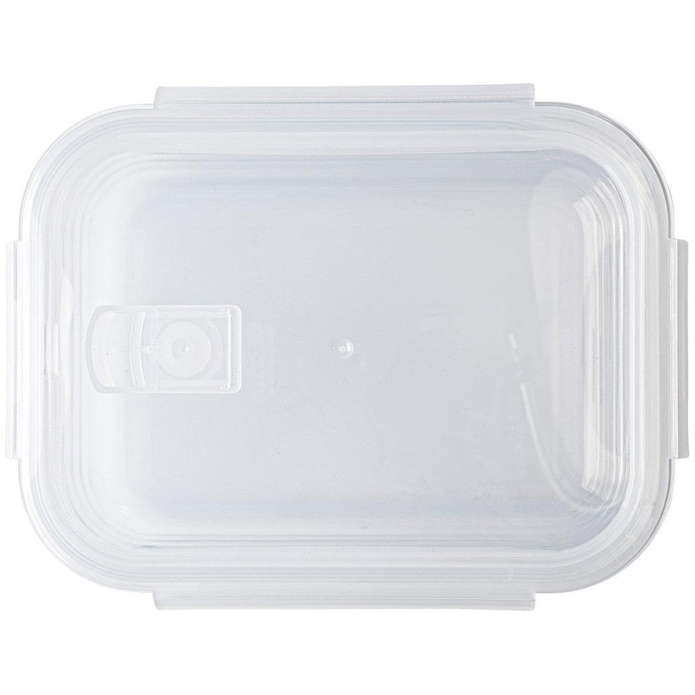 Вместительный ланч-бокс из боросиликатного стекла. Пластиковая крышка плотно прилегает благодаря четырём фиксирующим замкам. В крышке предусмотрено отверстие для использования в микроволновой печи.