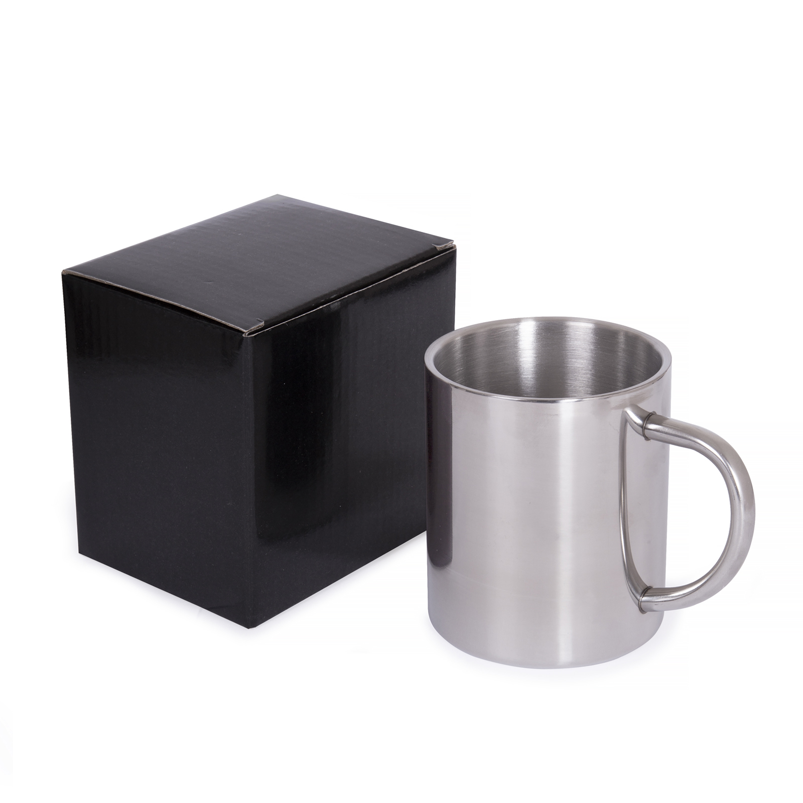 Кружка металлическая с двойными стенками под нанесение логотипа. Серебряная кружка с глянцевым покрытием, переливается. Черные и синий цвет с матовым покрытием. Высота 9,4 см. К каждой чашке уже идет подарочная упаковка черного цвета.