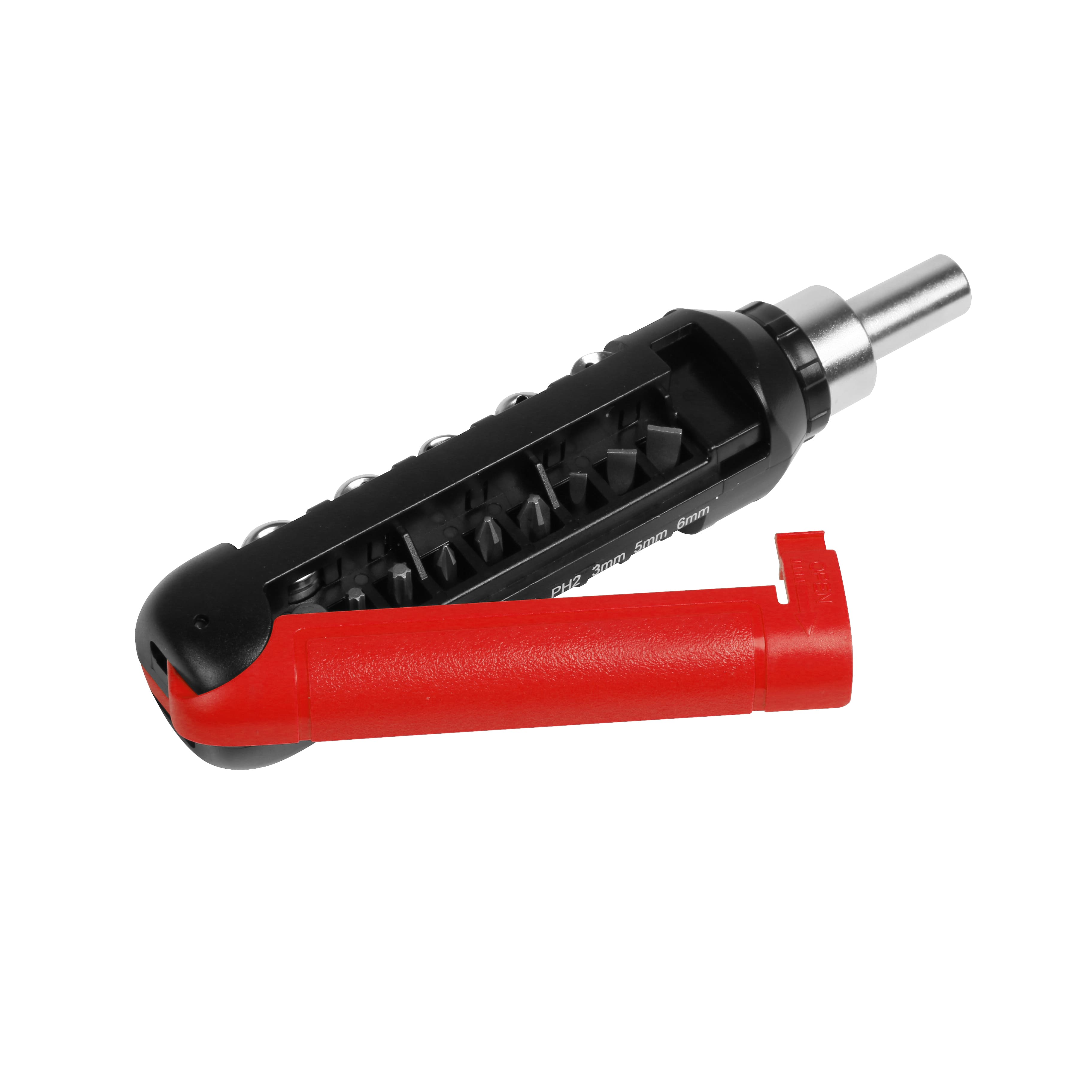 Отвертка изготовлена из пластика АБС и высококачественной стали. В комплект отвертки входит магнитный держатель, 9 бит (один адаптер – ADP, два шестигранника – Т15, Т20, три плоские – 3 мм., 5 мм.,6 мм., три крестовых – PH0, PH1, PH2) а также 5 головок торцевых ключей (6 мм., 7 мм., 8 мм., 9 мм, 10 мм.) Упакована в индивидуальную черную подарочную коробку и полиэтиленовый пакет. Размер в сложенном состоянии 16,5 см.