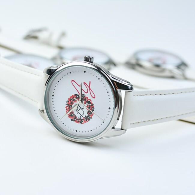 Брендированный циферблат, серебристый корпус и цветной ремешок из экокожи способны создать неповторимый фирменный аксессуар.