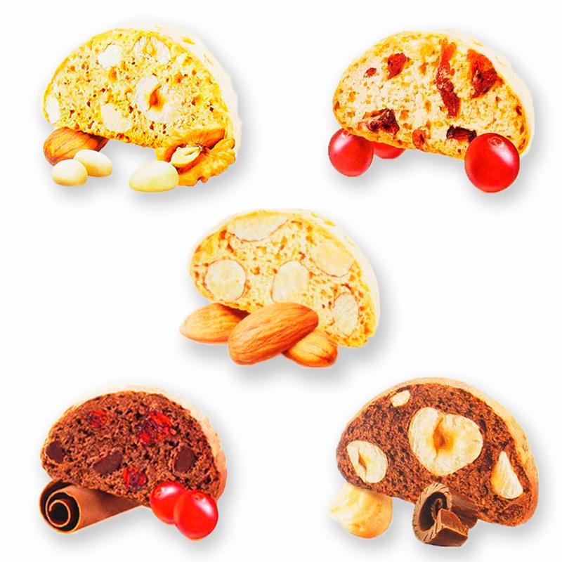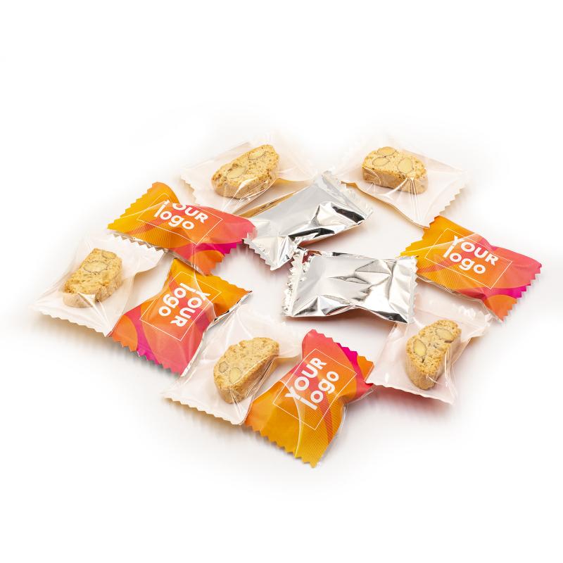 Печенье "Сantuccini" с логотипом (4,5 г) – это брендированная закуска с вариантами вкусов: клюква с шоколадом, ореховый микс, миндаль, клюква, шоколад с фундуком. Печенье упаковано в полипропиленовую плёнку с возможностью выбора прозрачной, металлической или жемчужной упаковки, на которой размещают логотип. Размер упаковки составляет 66 x 45 мм, а срок годности – 9 месяцев.