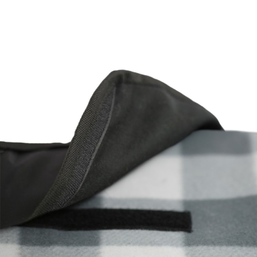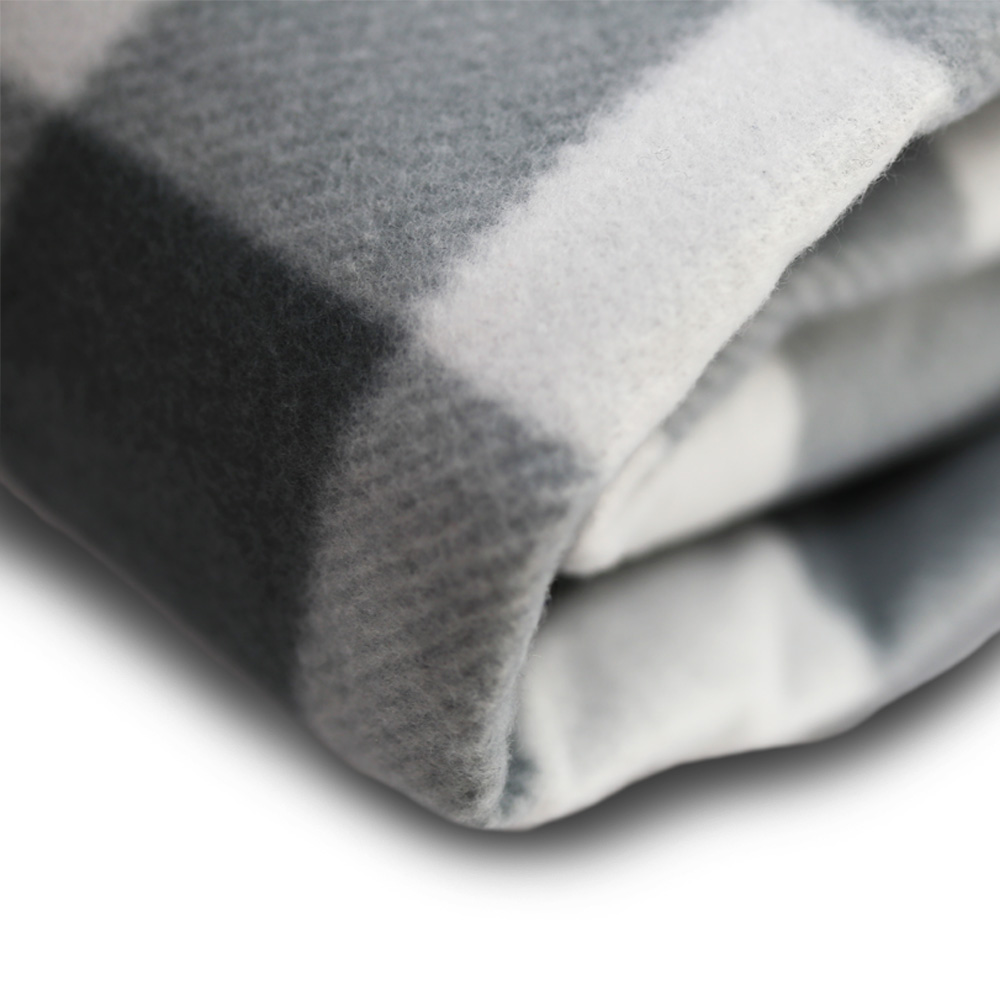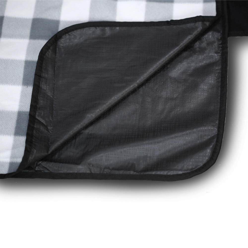 Плед двусторонний: с одной стороны — однотонный, с другой — в клетку. Нижняя часть выполнена из пены EVA, которая защищает от песка и влаги, легко очищается. Верхняя часть — из флиса. Плед удобно брать с собой в путешествия, он лёгкий и удобный для транспортировки.