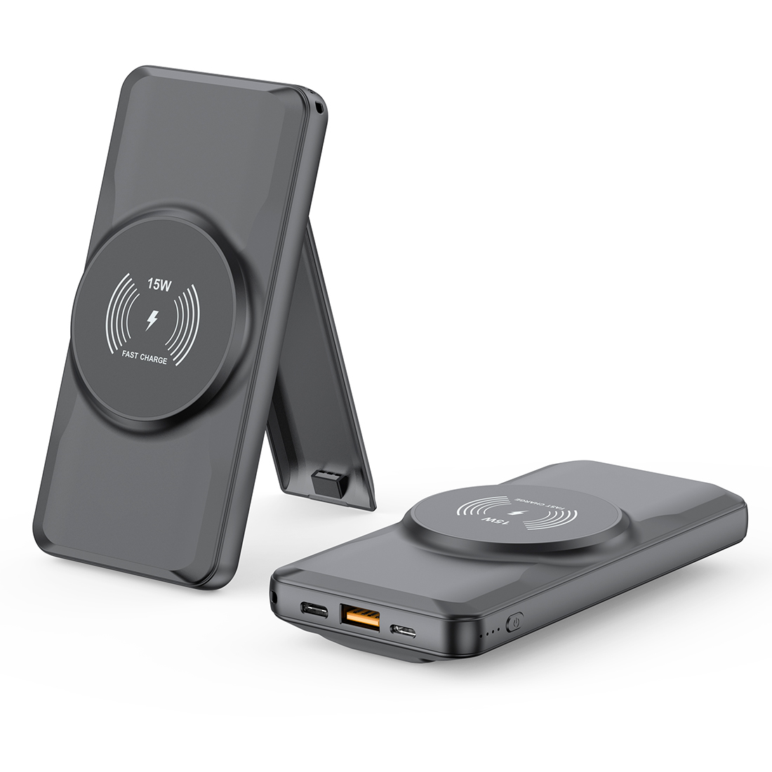 Емкость павербанка – 10000 mAh, мощность – 15 Вт. Для передачи энергии достаточно просто положить смартфон на павербанк лицевой стороной вверх. Эта модель оснащена опорой – трансформируемой ножкой, которая превращает павербанк в подставку для гаджета.