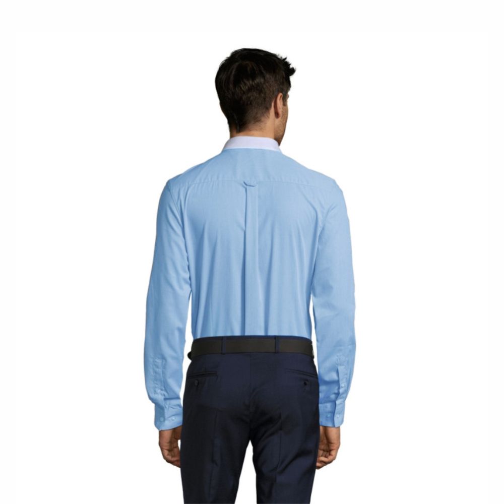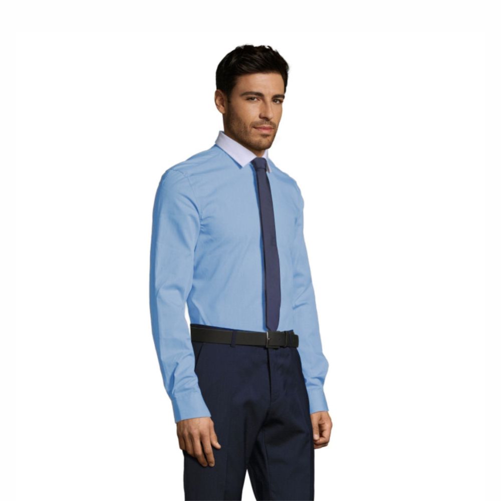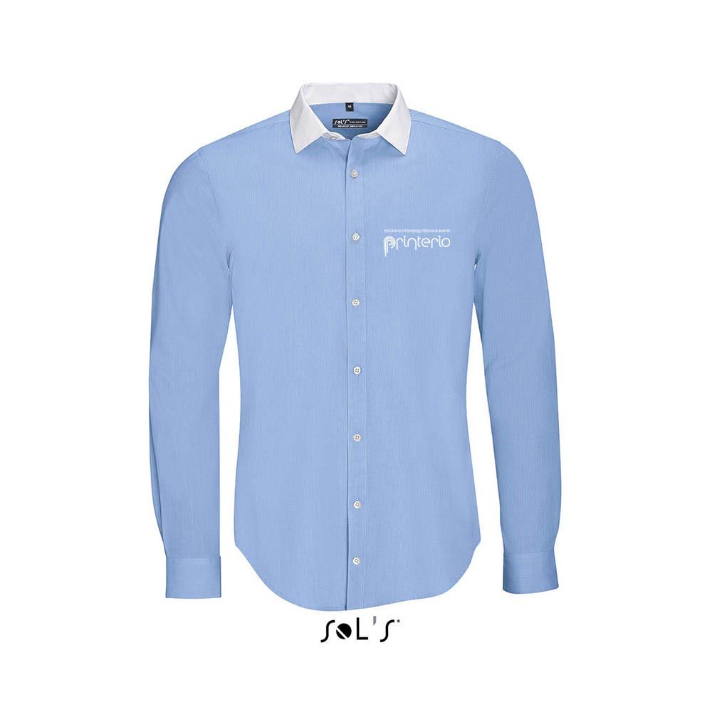 Мужская рубашка Belmont men с длинным рукавом, плетение "нить к нити". Полуприлегающий крой. Жёсткий итальянский воротник контрастного белого цвета. Манжеты на 2 пуговицах и разрез "капуцин". Двойная планка с 8 белыми пуговицами. Закруглённый низ. Вытачки по центру спины. 2 запасные пуговицы для планки и воротника. Обработка для облегчения ухода. Рубашка в стиле 80-х годов.