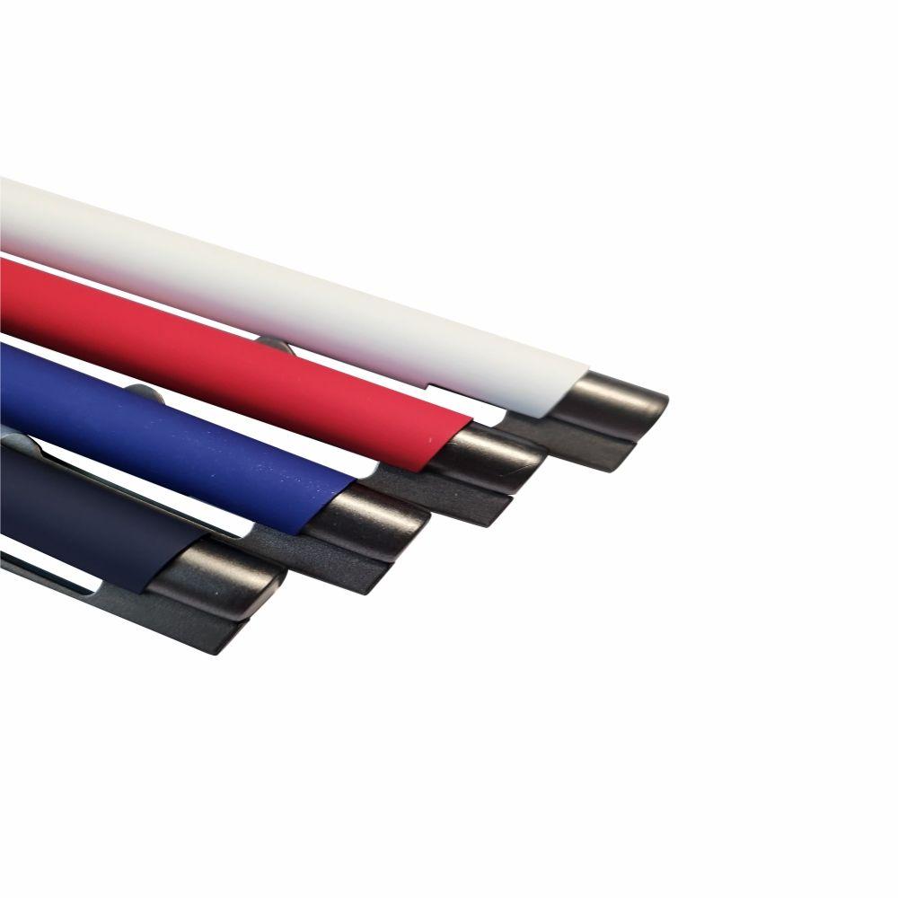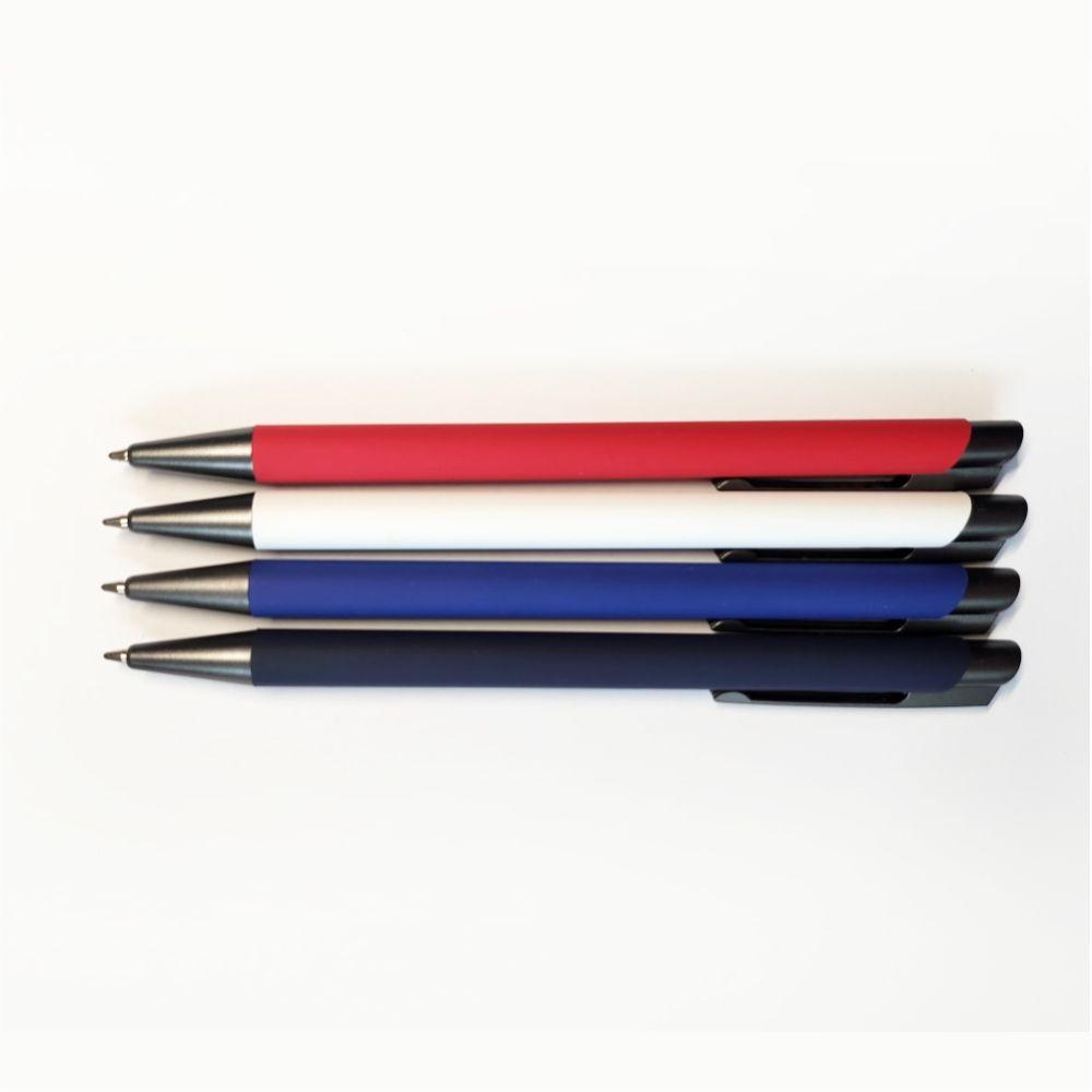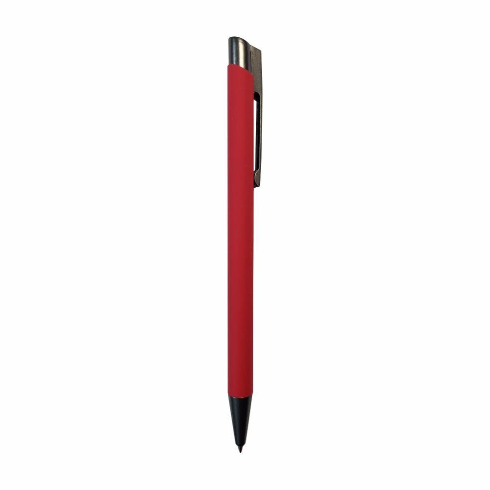 Корпус ручки выполнен из алюминия, сверху качественное покрытие Soft touch. Изделие оснащено кнопкой и наконечником серого цвета.