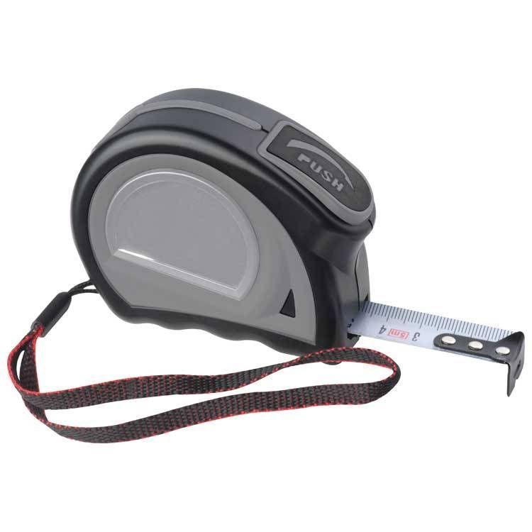 Рулетка длиной 5 м из стали, что делает ее очень крепкой. Корпус изготовлен из прочного пластика, что делает его устойчивым к механическим повреждениям. На ленте есть шкала сантиметр/миллиметр – на белом фоне. Правильный подбор красок делает шкалу разборчивой и очень долговечной. Чтобы облегчить измерение, сверху установлена большая кнопка блокировки. На рулетке есть ремешок, облегчающий перенос, а устройство не выпадает из руки во время работы – очень полезно для работы на высоте. Есть возможность размещения логотипа на боковых поверхностях корпуса.