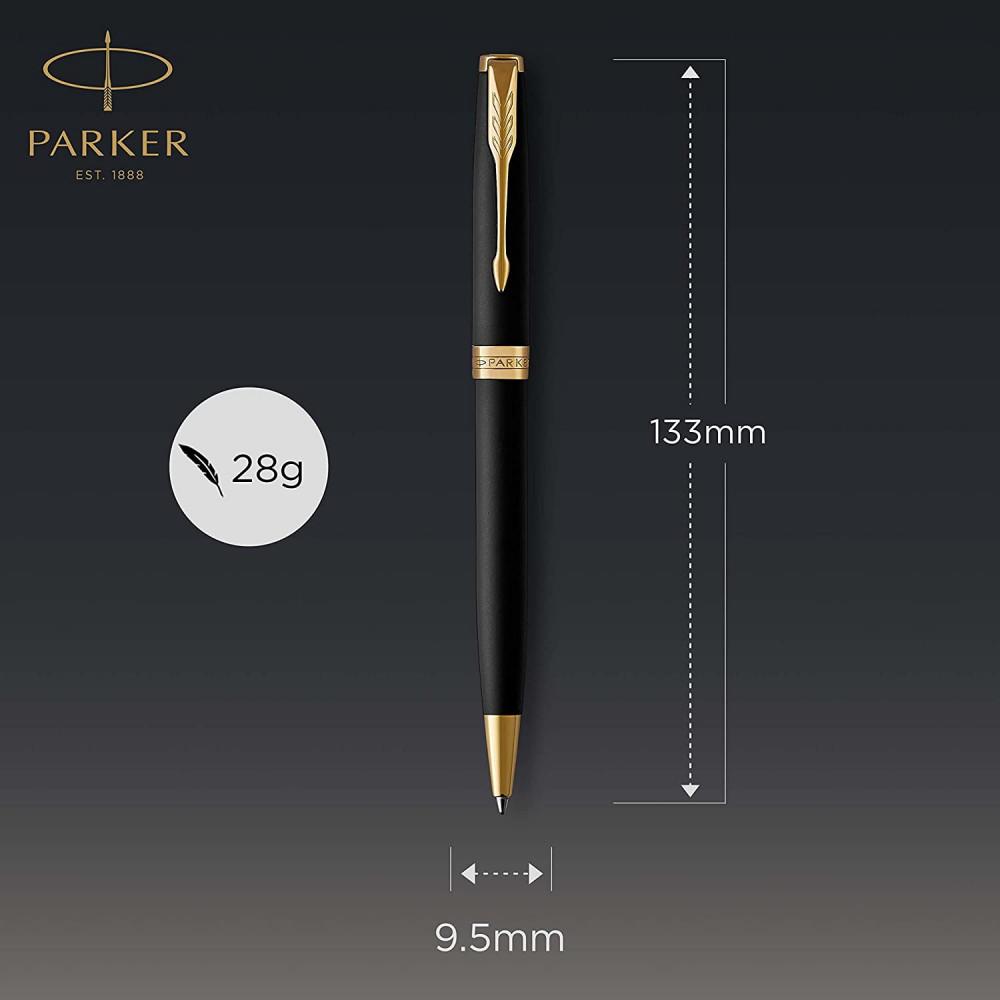 SONNET Matte Black GT BP – изысканная шариковая ручка Parker из премиальной линейки Sonnet (Сонет) в классическом дизайне. Элегантно выглядит и приятно ощущается в руке благодаря тяжелому латунному корпусу с черным матовым покрытием и контрастной золотой отделке.