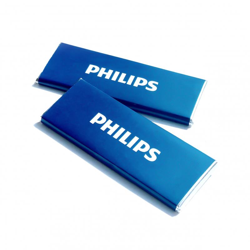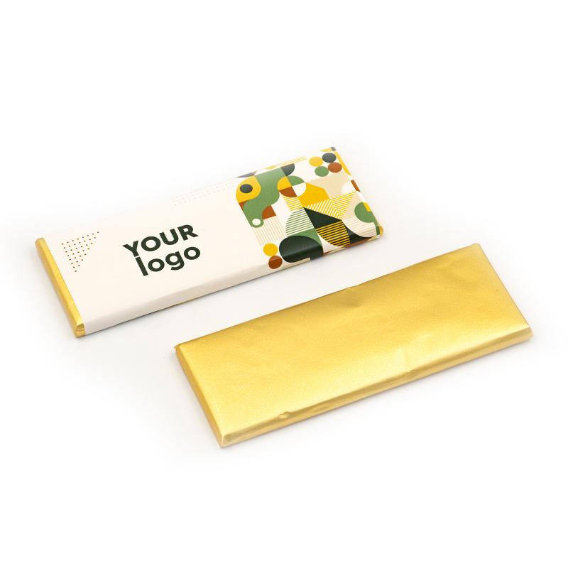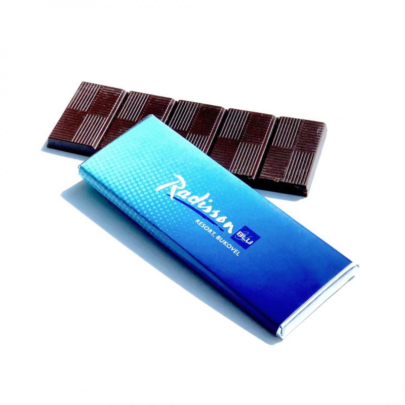 Компактные шоколадные плитки с вашим логотипом. На выбор сертифицированный молочный 33 % шоколад или черный 60 %.