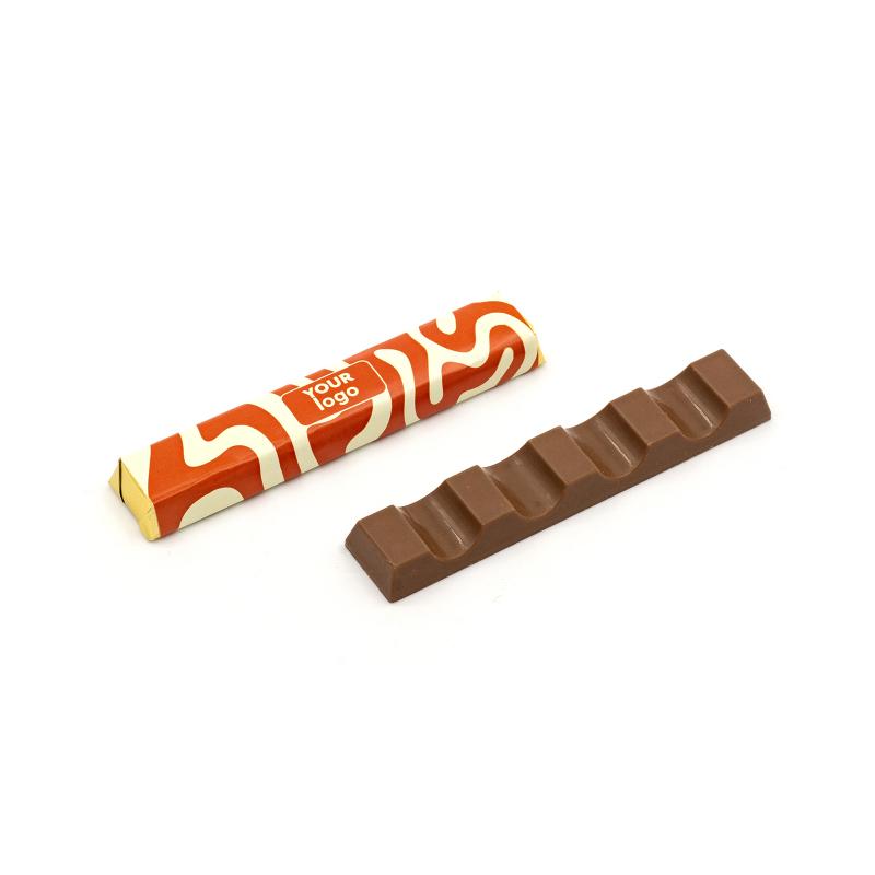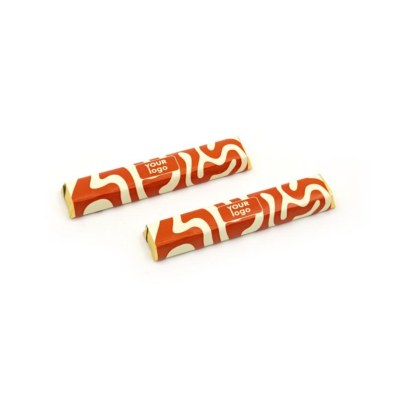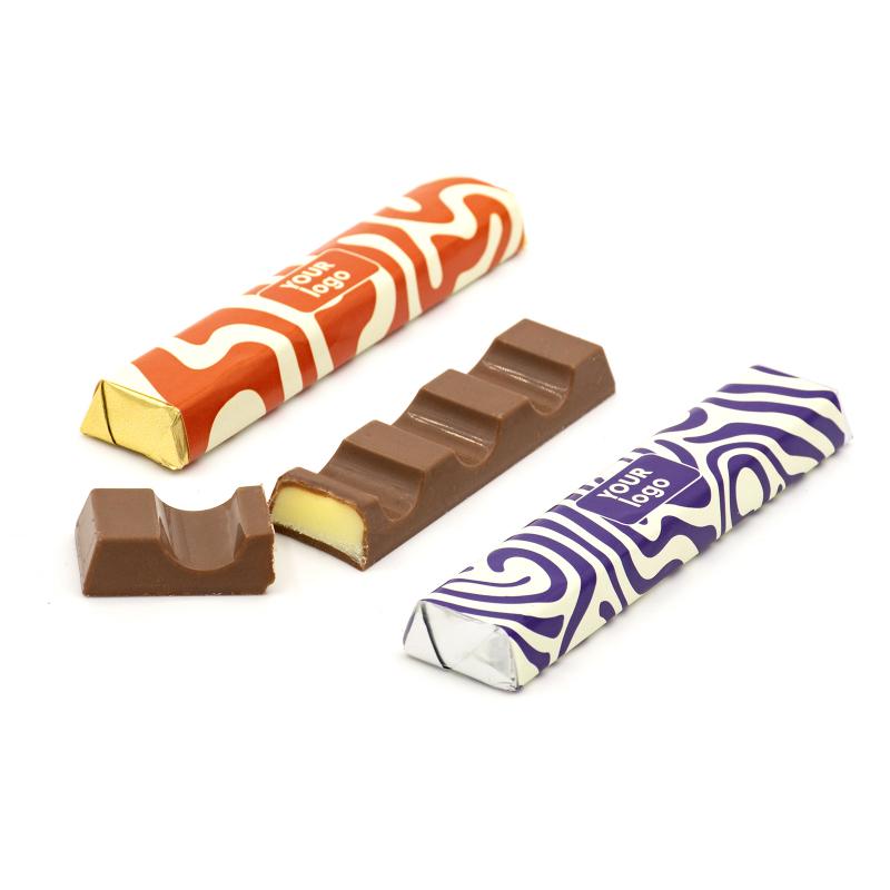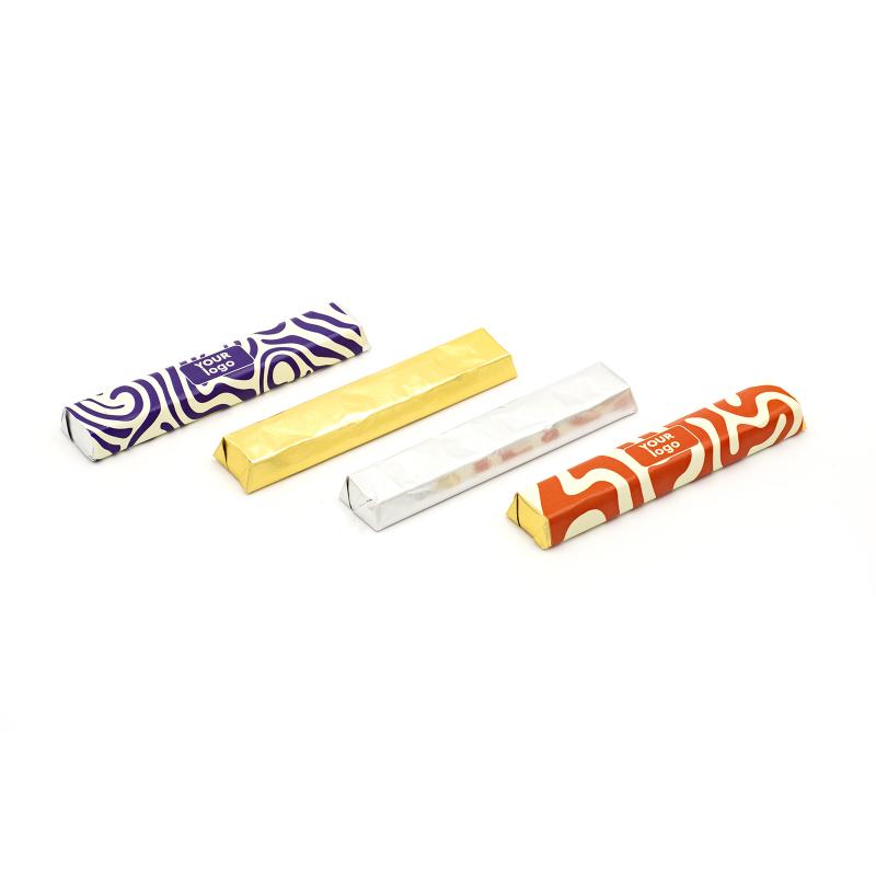 Шоколад с начинкой и логотипом весом 21 г — это вкусный и привлекательный сувенир, изготовленный из нежного молочного шоколада с молочной начинкой. Батончик имеет вытянутую форму (размер 110 × 21 × 10 мм) и упакован в стильную фольгу золотого или серебряного цвета. Сверху нанесена полноцветная печать на мелованной бумаге плотностью 90 г. Такой формат упаковки типа флат идеально подходит для брендирования, подарочных наборов или рекламных акций.