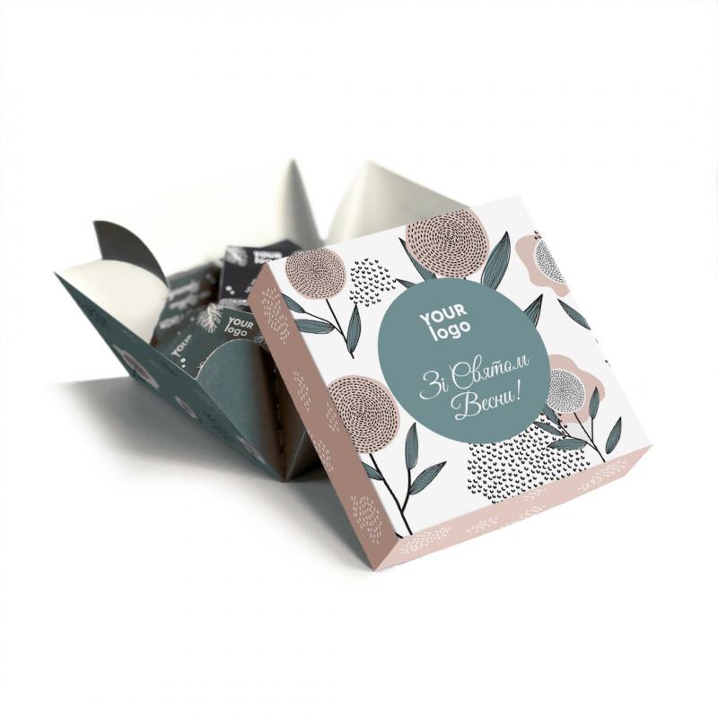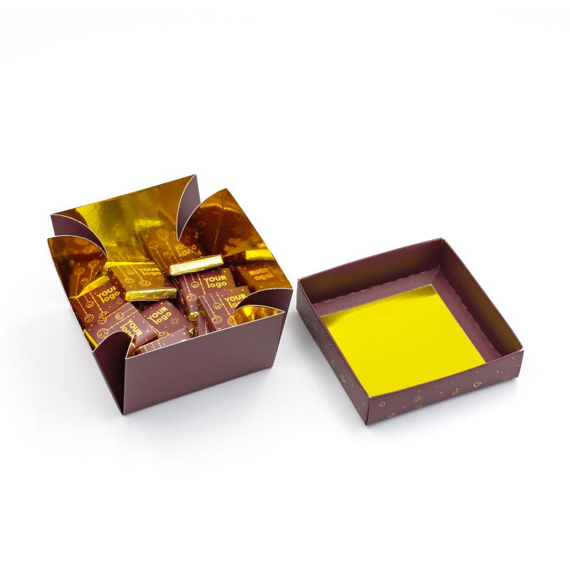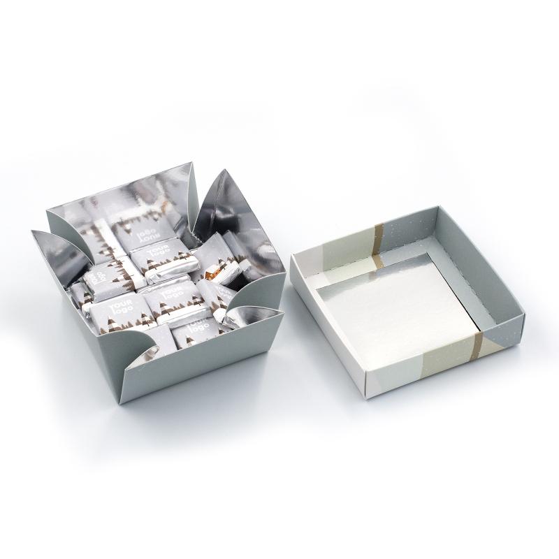Шоколадный набор "Куб" 150 г с индивидуальным логотипом — это стильный подарок с изысканным наполнением на выбор: чёрный шоколад 60%, молочный 33% или микс. Упакован в качественную картонную коробку (плотность 230 г/м²) с цветной печатью и ламинацией (матовой или глянцевой). Размер коробки — 90×94×62 мм. Этикетка — мелованная бумага 90 г/м². Цвет фольги для конфет — золотой или серебряный. Дополнительные услуги: двухсторонняя печать 4+4, тиснение фольгой (золото/серебро), внутреннее ламинирование золотом или серебром. Идеально подходит в качестве корпоративного сувенира.