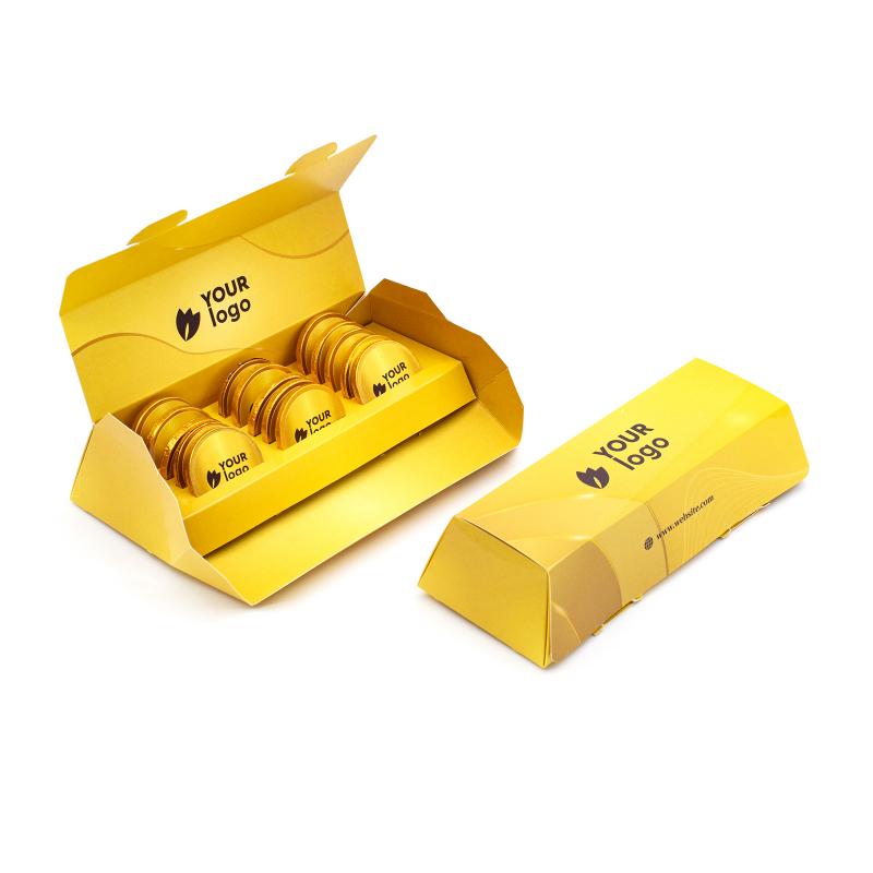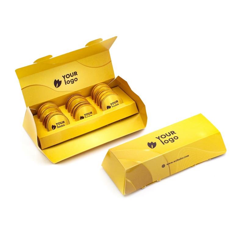 Премиальный подарочный набор в виде золотого слитка — идеальное решение для корпоративных подарков или промо-акций. Упакован в стильную картонную коробку типа «книга» с возможностью нанесения логотипа. Возможна матовая или глянцевая ламинация и тиснение фольгой (золото/серебро) для повышения визуальной привлекательности.