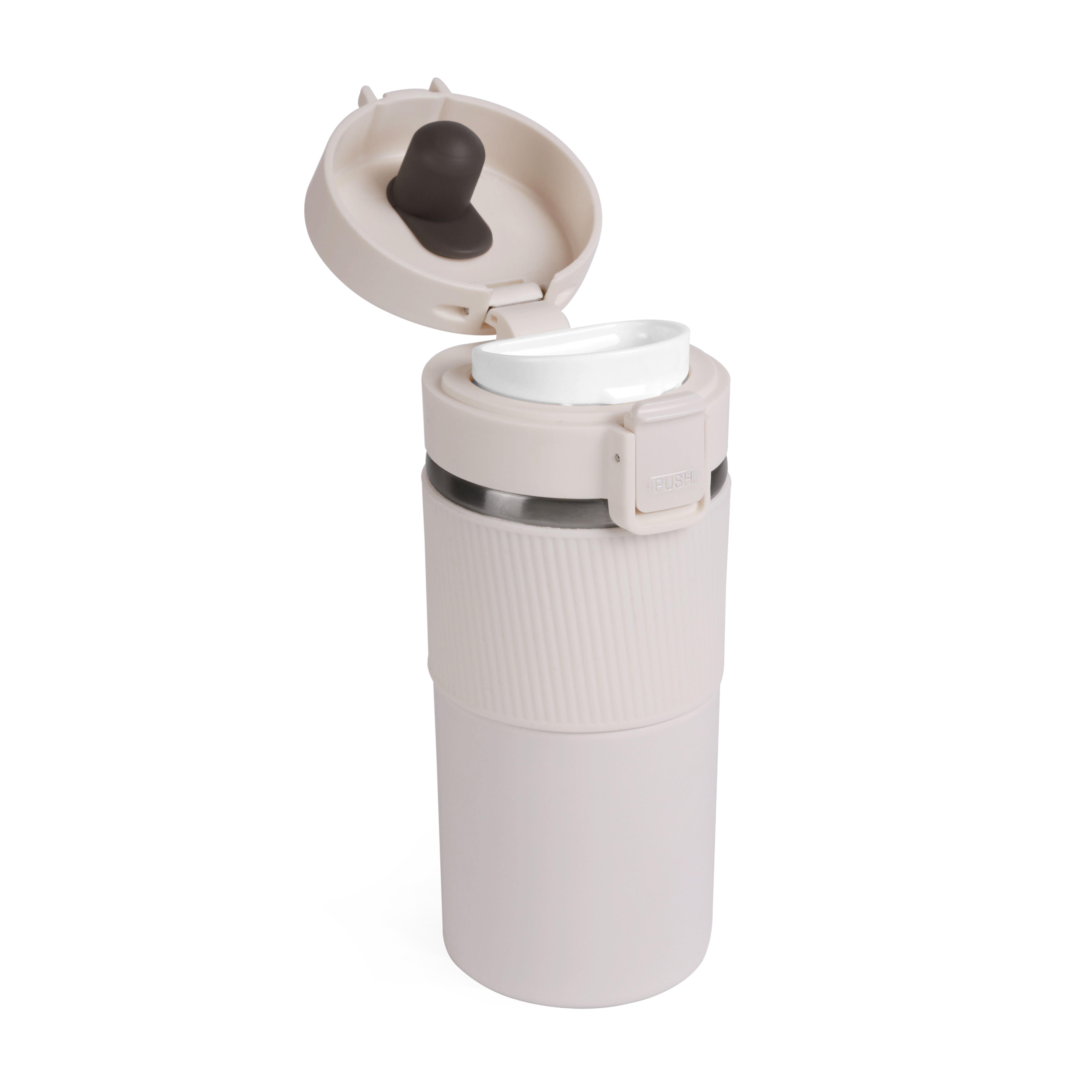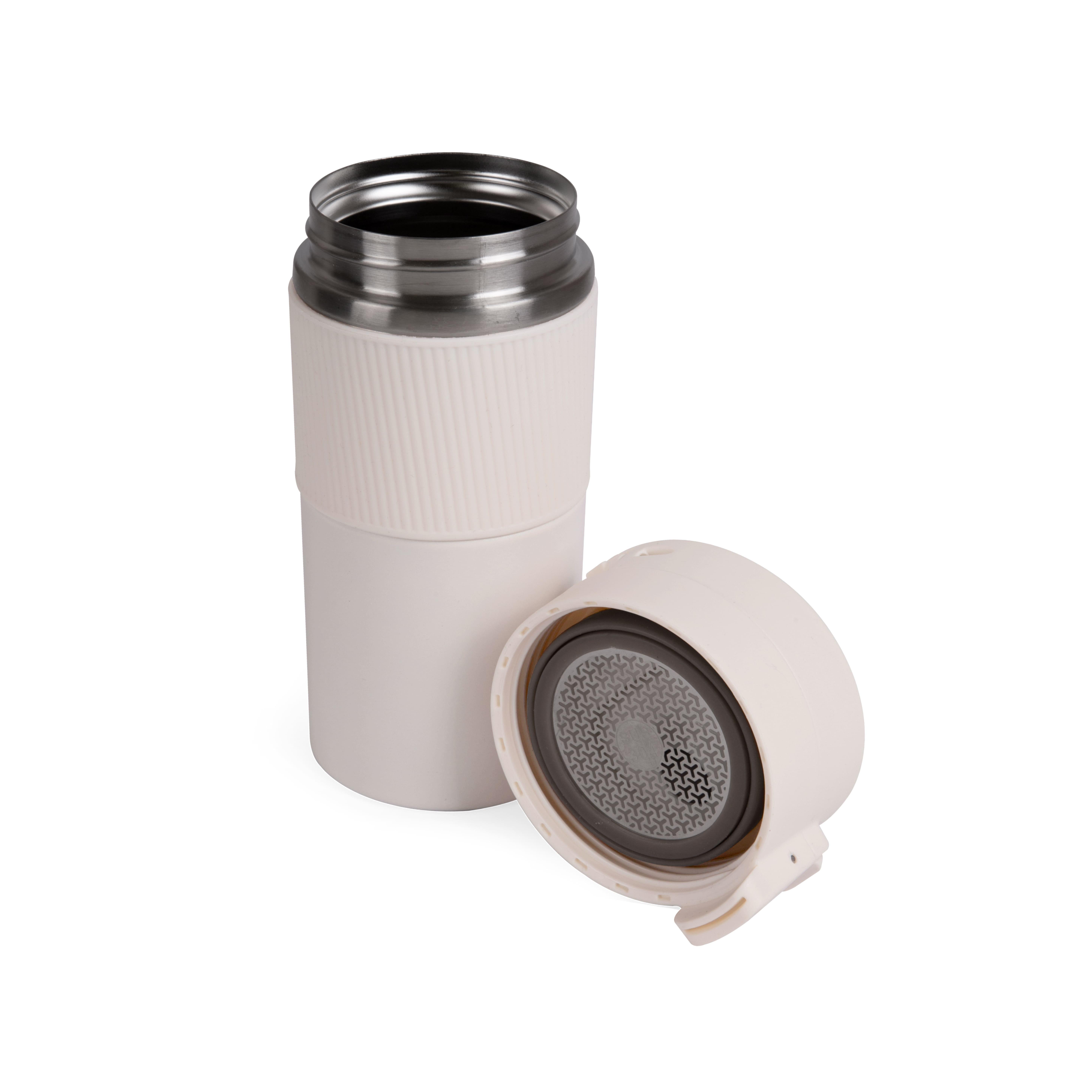 Вакуумная термокружка из нержавеющей стали объем 370 мл. , покрытая матовой цветной эмалью, крышка-непроливайка с ситечком, которая при необходимости блокируется от случайного открывания. Поддерживает температуру до 6 часов. Упакована в индивидуальную черную коробку и полиэтиленовый пакет. Высота 18,6 см., диаметр 7 см.