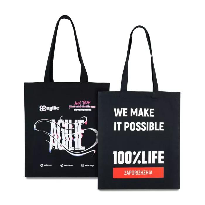 - Тканина: чорна бавовна, канвас, 220 г/кв.м (чорна сумка); невибілена бавовна, канвас 220 г/кв.м (бежева сумка)