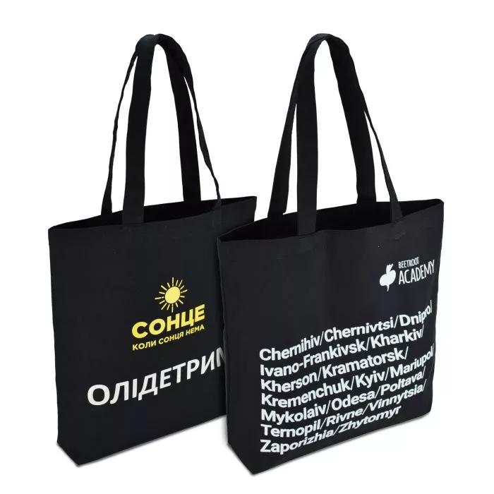 Еко сумку зшито з високоякісної бавовни чорного кольору. Особливості сумки шопера: міцні шви, глибоке дно, тканинна щільна ручка, надійна машинна закріпка ручок. Сумка витримує до 20 кг.