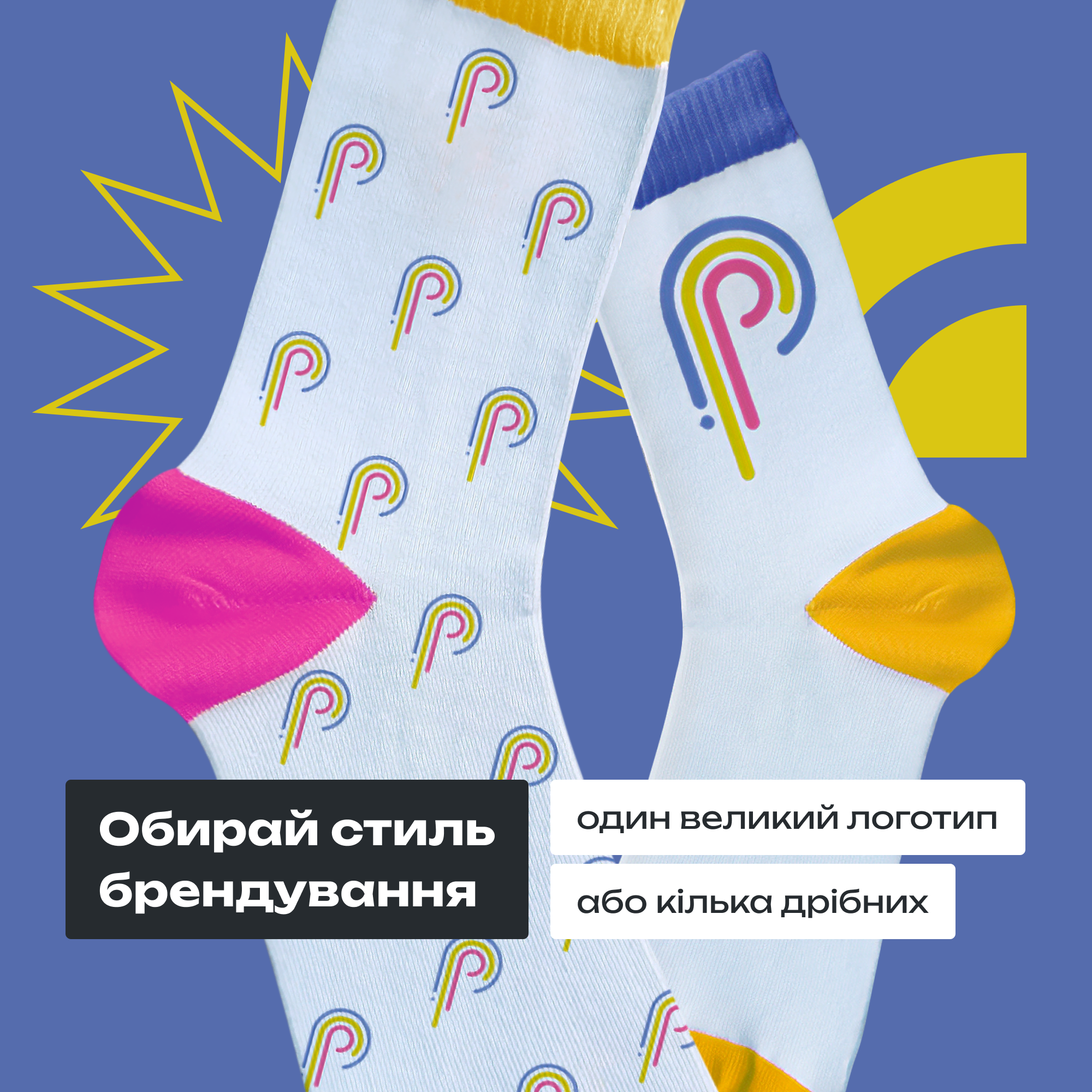 На ваше бажання, можна зробити шкарпетки з правим і лівим малюнком, так щоб ваше лого розташовувалося тільки на зовнішній стороні ноги. Оскільки такі шкарпетки більш трудомісткі у виробництві та в'яжуться окремо правий і лівий, є деякі особливості вартості або кількості мінімального замовлення.