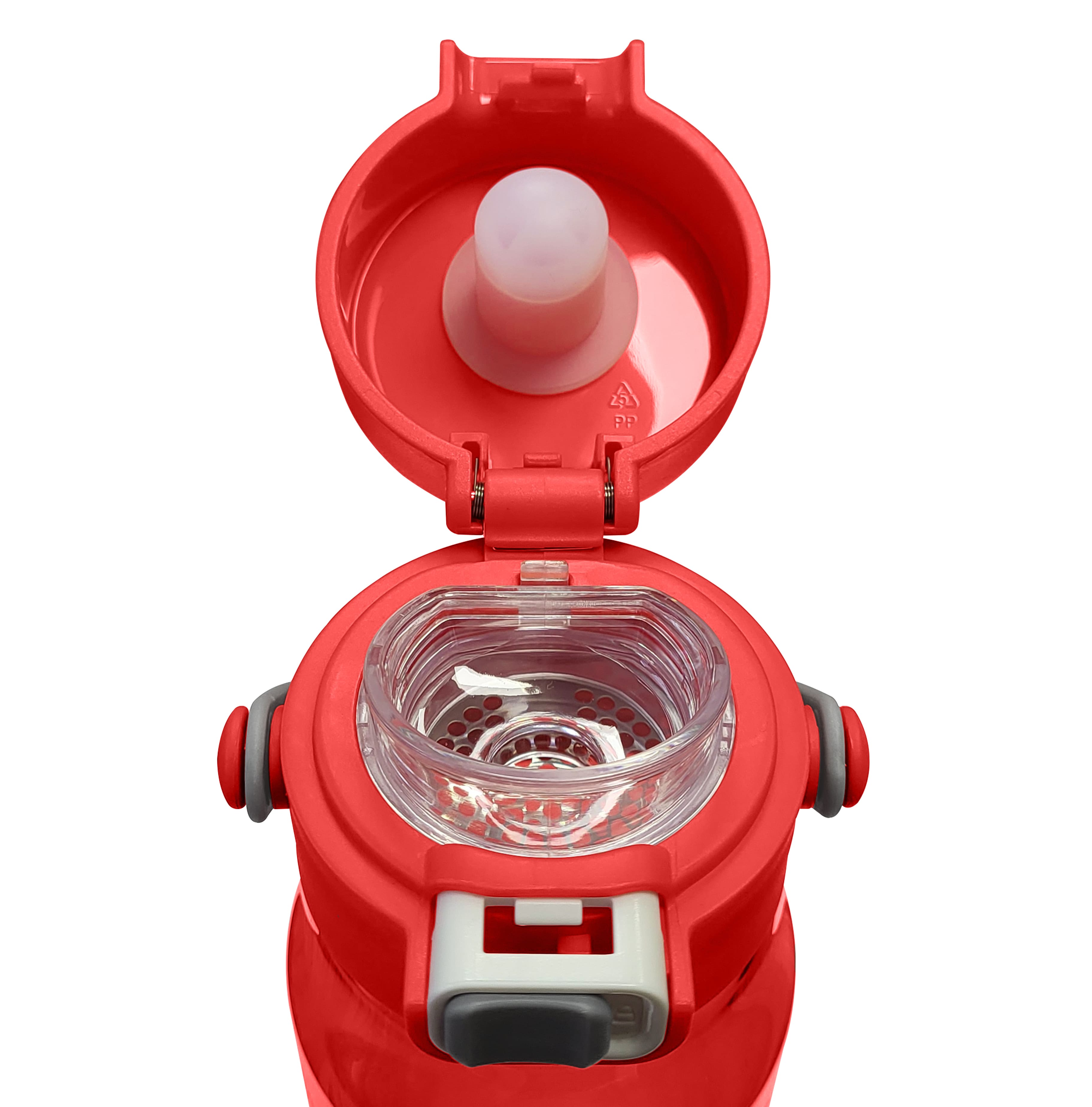 Пляшка для пиття 640 мл, матеріал пластик (BPA FREE), кришка з надійним відкидним механізмом, яка відкривається та блокується флеш-кнопкою, має силіконову ручку, яку зручно тримати або переносити пляшку, в середині кришки вмонтовано з'ємне ситечко з нержавіючої сталі. Розмір: висота 22 см, діаметр колби 7 см. Індивідуальна картонна подарункова коробка. Розмір індивідуальної коробки: 22,6 х 9 х 8 см.