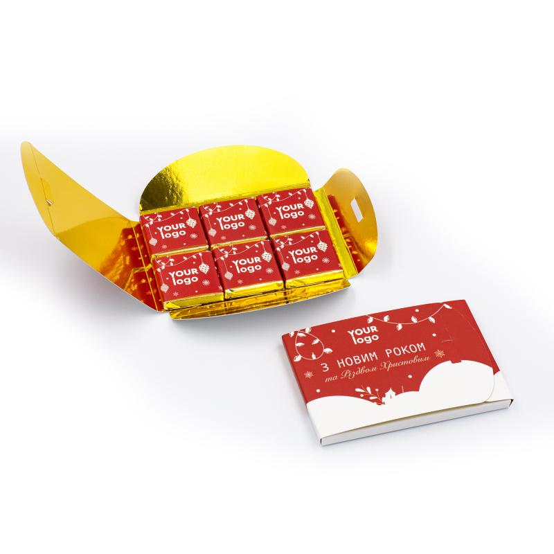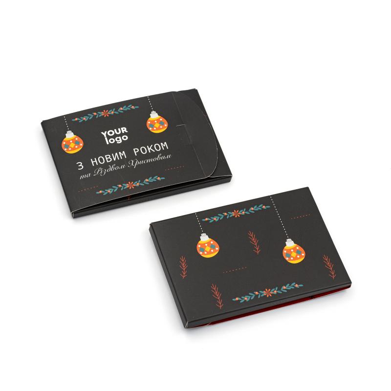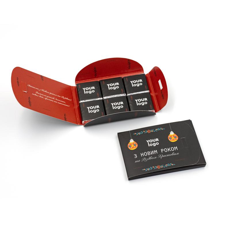 Маленькі шоколадки в стильній упаковці. Легко дарувати, займають мало місце. Зберігаються 10 місяців. Оформляйте заявку на сайт або дзвоніть у відділ продажу. Розрахуємо ціну, яка залежить від тиражу. В наявності: молочний, чорний, білий шоколад.