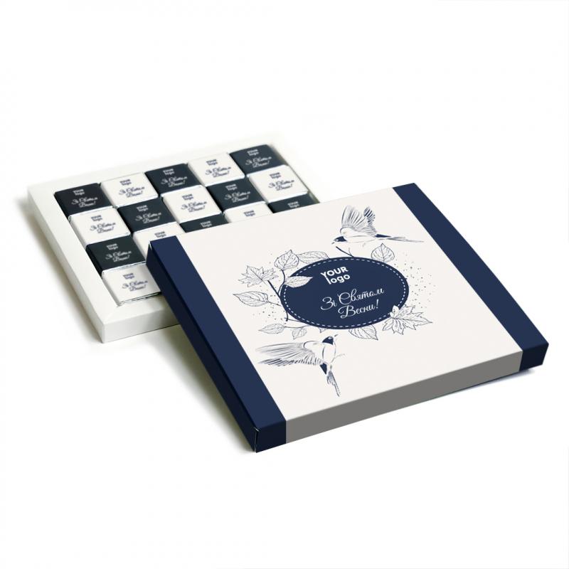 Шоколадний набір "Пенал" 100 г — елегантний подарунок із можливістю брендування. У комплекті — натуральний німецький шоколад преміум класу (молочний, чорний або мікс). Упакований у стильну картонну коробку (193×158×18 мм) з білою основою, можливий повнокольоровий друк, ламінування (матове або глянцеве), а також тиснення фольгою (золото/срібло). Фольга цукерок — на вибір: золота або срібна. Ідеально підходить для корпоративних подарунків з логотипом.